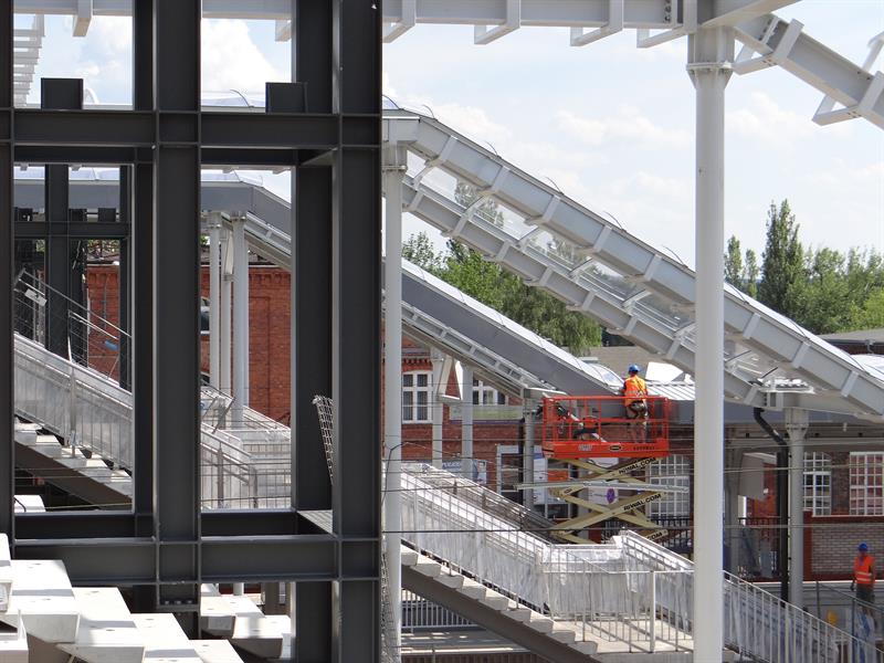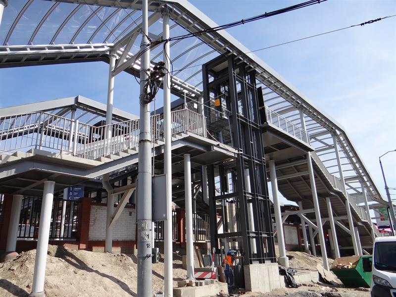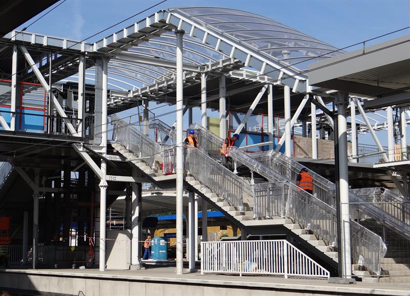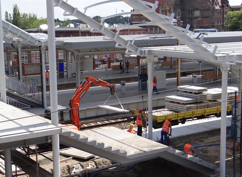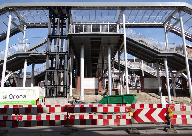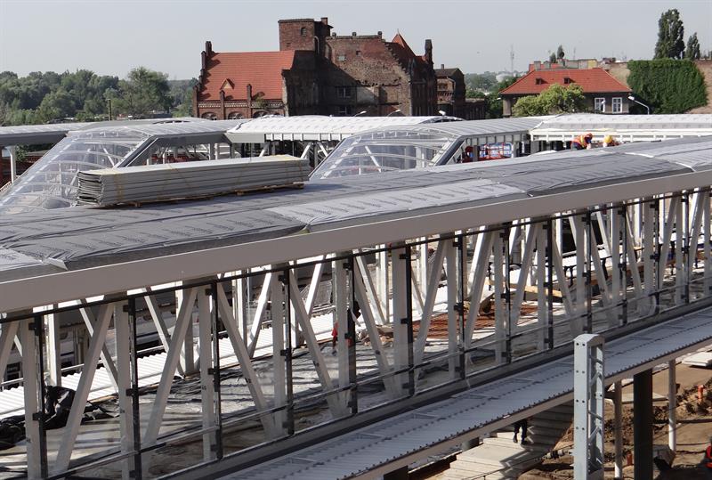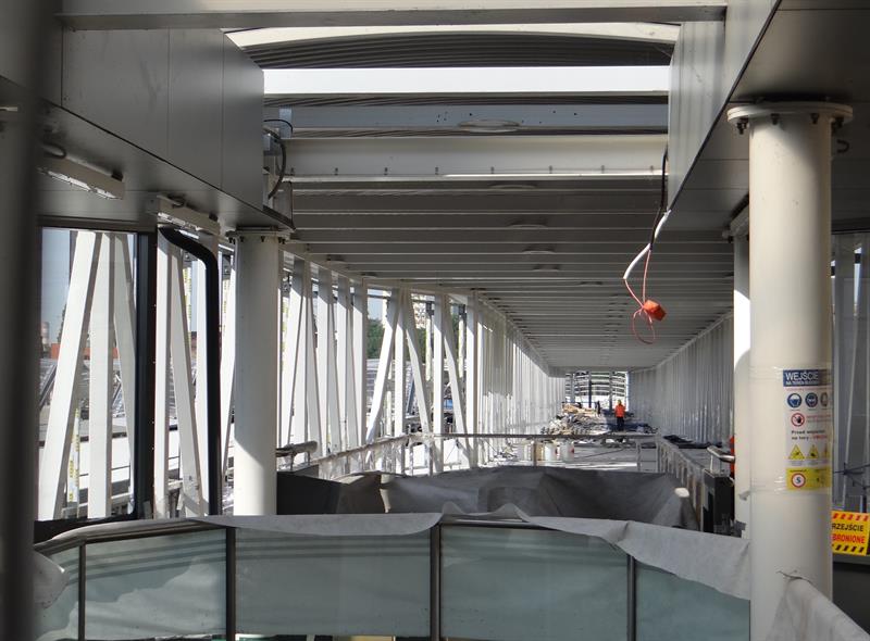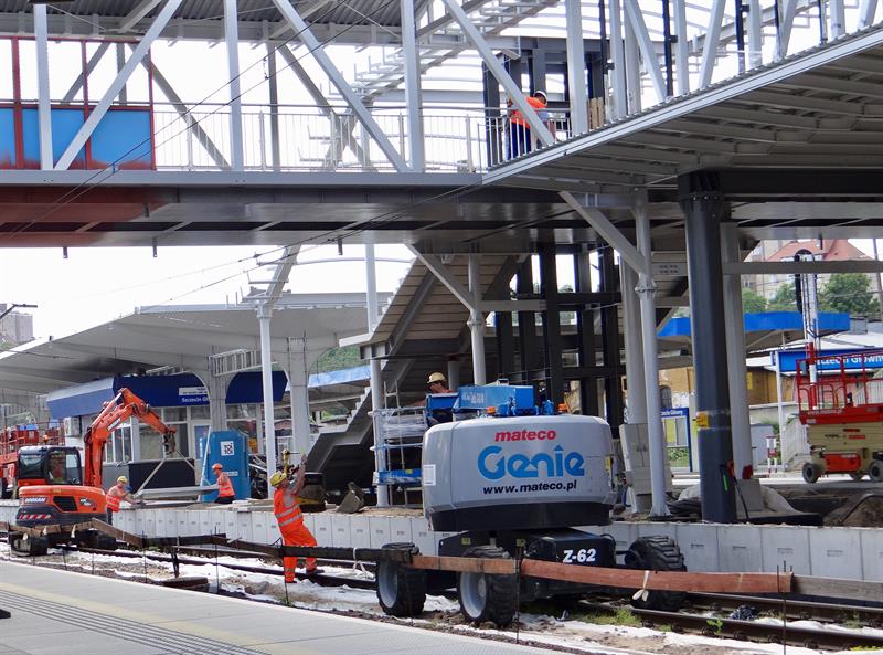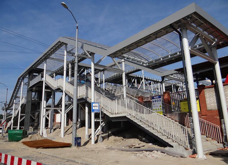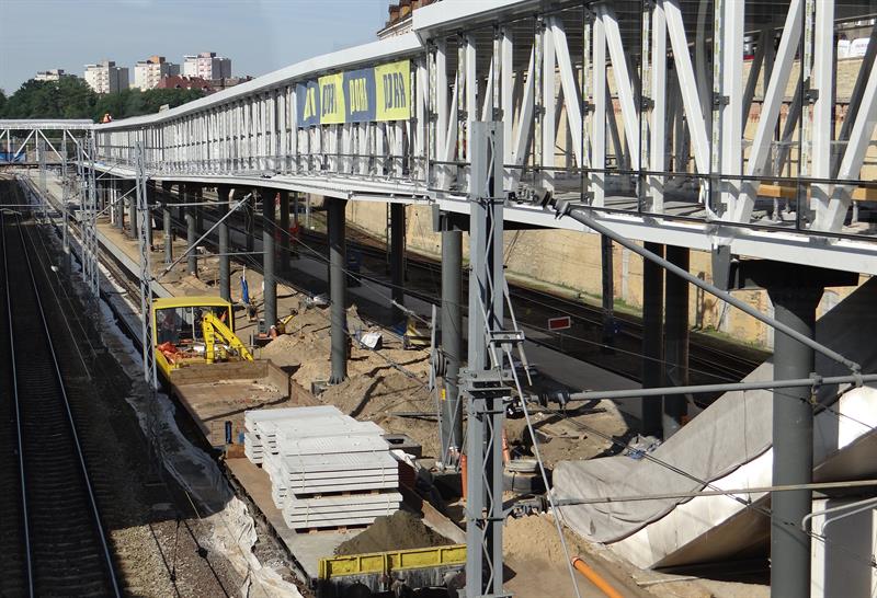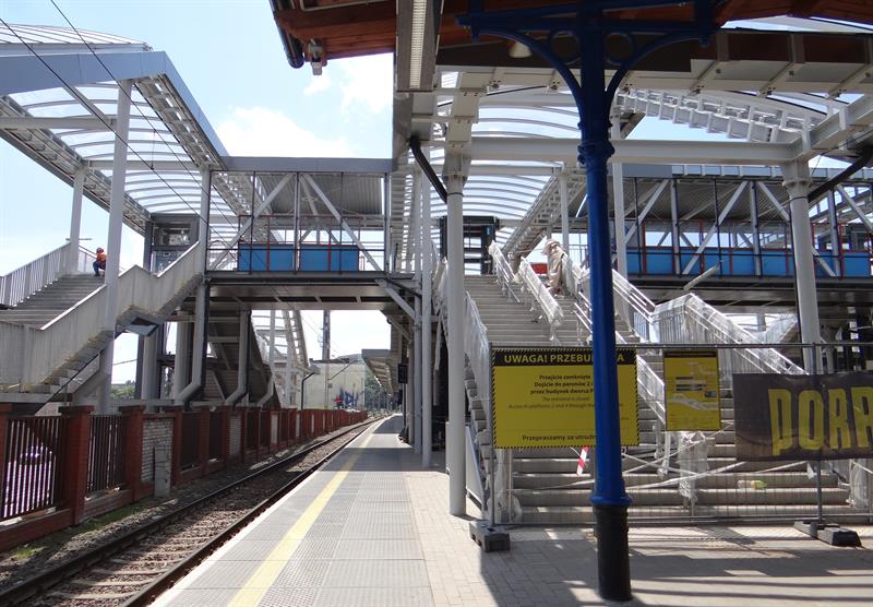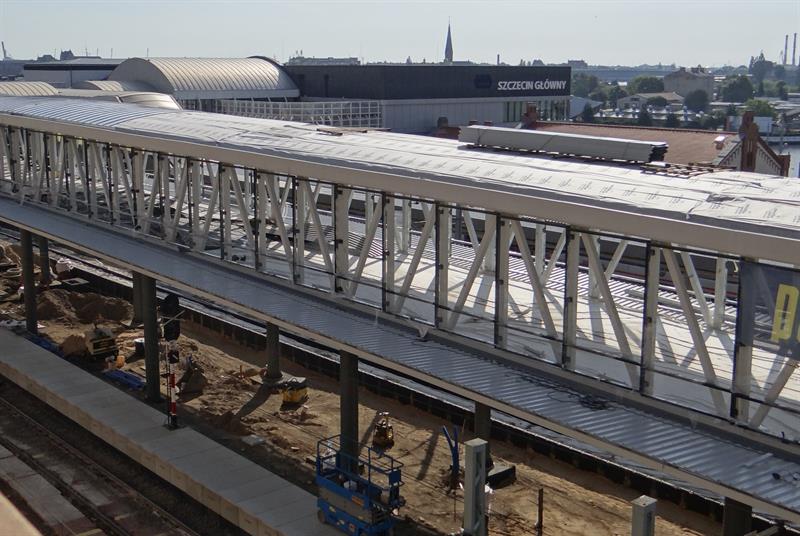 Na ukończeniu są też prace przy montażu paneli zadaszenia nowej kładki nad przebudowywanym nadal peronem trzecim stacji. Połączy ona obecnie modernizowaną starą kładkę wraz z dojściami na pozostałe perony z tą wzniesioną przed kilku laty z hali głównej stacji do ul. Owocowej.