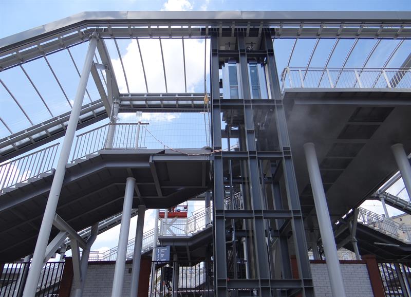 Na modernizowanej starej kładce szczecińskiego dworca nad torami od ul. Krzysztofa Kolumba do ul. Stefana Czarnieckiego trwają prace przy montażu nowych balustrad i poręczy przy zejściach nowymi schodami na poszczególne perony. Nad nimi i nad dobudowanymi do nich konstrukcjami szybów wind pojawiły się już także przeszklone zadaszenia.