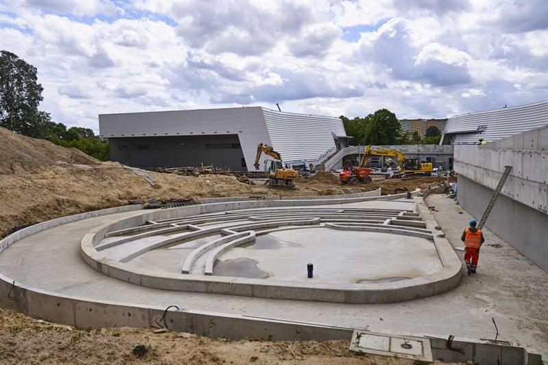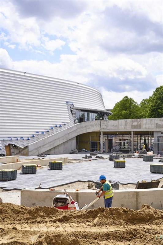 Prace toczą się również na zewnątrz. Jak podaje rzecznik, trwa zabetonowywanie płyty kaskady wodnej, wykonywane są podbudowy pod murki toru lodowego i amfiteatru. Prowadzone są prace brukarskie i drogowe przy parkingu, obok budynku basenowego. Wykonawca rozpoczyna również prace przy montażu instalacji fotowoltaicznej na wiacie do ładowania samochodów elektrycznych.