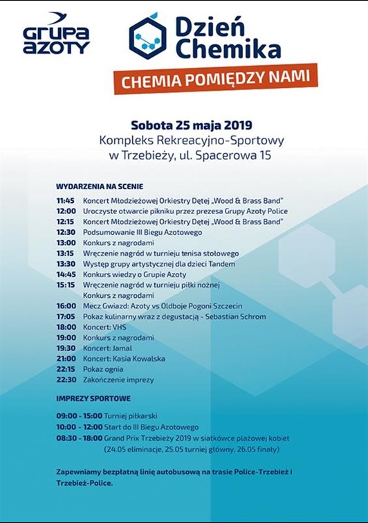 Najmłodsi będą mogli szaleć w dmuchanych zamkach, na nieco starszych czekają „Warsztaty Małego Chemika”. W tym czasie rodzice skorzystają z atrakcji gastronomicznych, pokibicują zakładowym sportowcom, a po południu obejrzą występy gwiazd estrady. Koncert rozpocznie zespół VHS, później do akcji wkroczy Jamal, a w wieczornej części festynu zobaczymy i posłuchamy Kasi Kowalskiej.