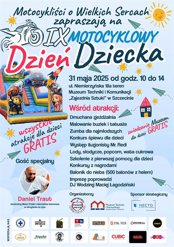 Na IX Motocyklowy Dzień Dziecka zapraszają Motocykliści o Wielkich Sercach. Na dziedzińcu muzeum dczekać będą: iluzjonista Mr Redi, Teatr Rozmaitości „Gwitajcie”, tancerze zumby, obecny będzie Daniel Traut - dwukrotny mistrz Polski i rekordzista Guinnessa w strzyżeniu na czas. Dzieci mogą liczyć na lody, watę cukrową, słodycze, zwiedzanie muzeum i dmuchaną zjeżdżalnię – wszystko za darmo. W niebo polecą baloniki, rozegrane zostaną konkursy, w których każdy uczestnik dostanie nagrodę, będzie malowanie buziek. Członkowie Wodnego Ochotniczego Pogotowia Ratunkowego poprowadzą szkolenia dla dzieci z udzielania pierwszej pomocy. Dzieci będą mogły z bliska przyjrzeć się motocyklom, rarytasem będzie motocykl wyścigowy szczecińskiego klubu sportowego „Mako Ring”.