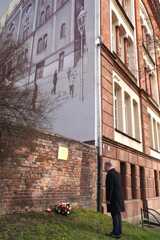 Pamiętając o ofiarach „Nocy Kryształowej”, Krzysztof Męciński oddał hołd ofiarom Holocaustu także przy tablicy upamiętniającej Gminę Żydowską, która znajduje się na ul. Dworcowej, w miejscu dawnej synagogi, spalonej przez Niemców w nocy 9/10 listopada 1938 r.