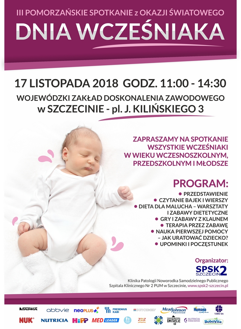Klinika Patologii Noworodka szpitala na Pomorzanach zaprasza w sobotę (17 listopada) wcześniaki małe, większe i największe oraz ich rodziców na obchody Światowego Dnia Wcześniaka. Wydarzenie odbędzie się w Wojewódzkim Zakładzie Doskonalenia Zawodowego przy pl. Kilińskiego 3 w Szczecinie. Początek o godz. 11.