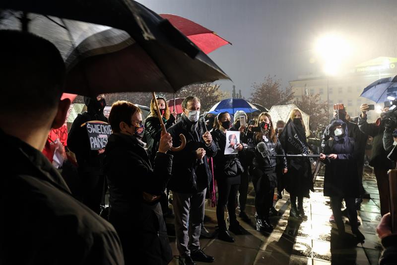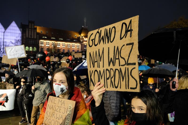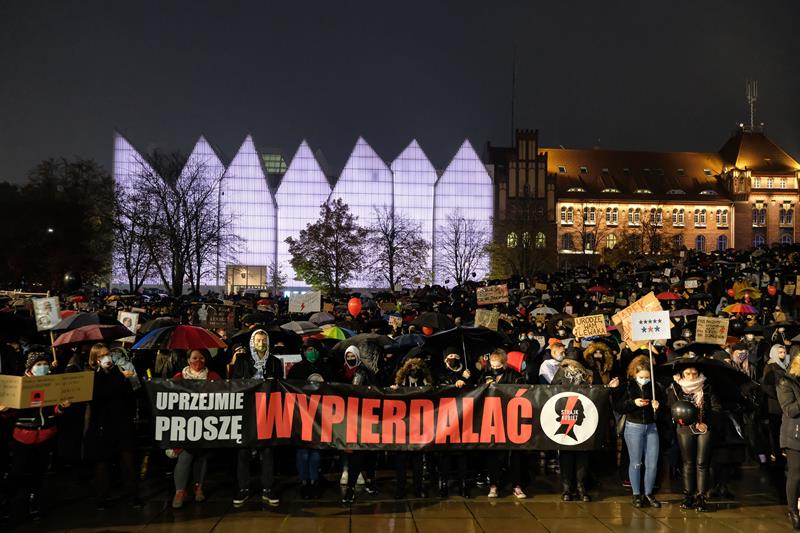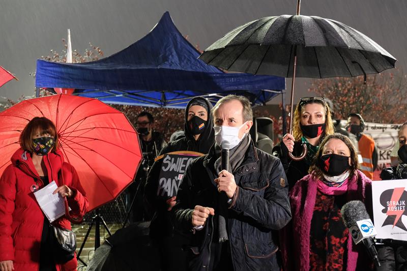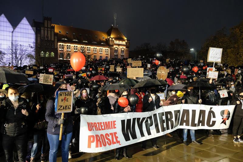 Mimo deszczowej pogody i apeli rządu o powstrzymanie się od strajków z powodu pandemii koronawirusa, przeciwnicy zaostrzenia prawa aborcyjnego tłumnie zebrali się na placu Solidarności. Manifestujący wyrazili swój sprzeciw wobec niedawnego wyroku Trybunału Konstytucyjnego. Ponadto przedstawili swoje żądania. Wśród nich m.in. nowe wybory, prawa kobiet w tym legalna aborcja, a także świeckie państwo i Polska bez konkordatu. Protestujący przynieśli swoje banery i transparenty, z którymi manifestują od kilku dni. Widniały na nich m.in. takie hasła, jak: "To jest wojna", "Wybór, nie zakaz". "No Woman, no Kraj". Na placu Solidarności pojawili się również politycy.