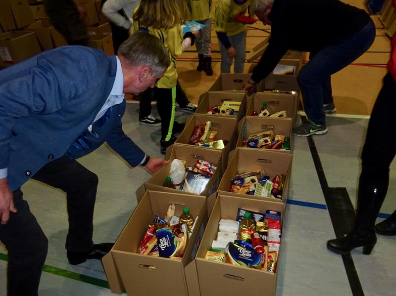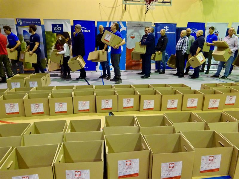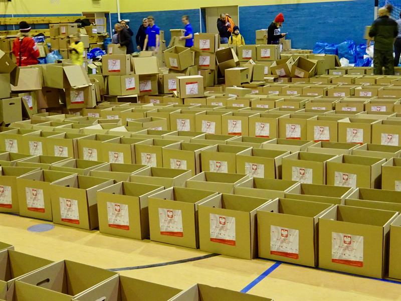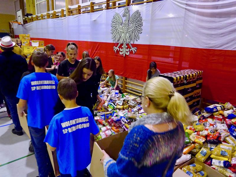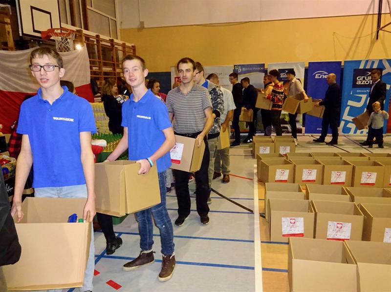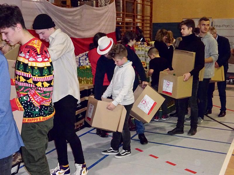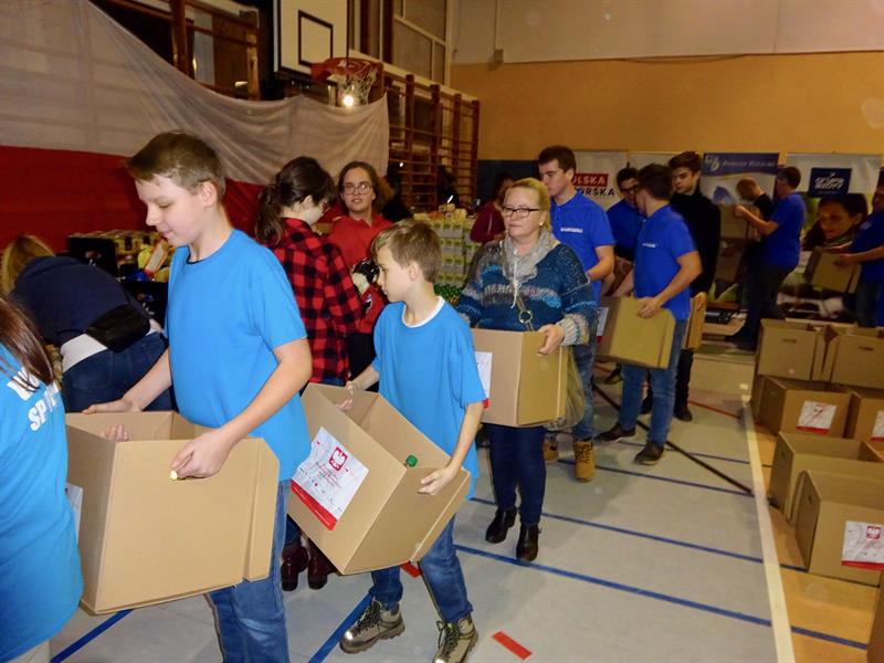 Na sali sportowej przecławskiej podstawówki paczki sprawnie pakowało około 150 osób - dzieci, młodzieży, przedstawicieli firm, gminy Kołbaskowo, instytucji związanych ze Szczecinem i województwem zachodniopomorskim.