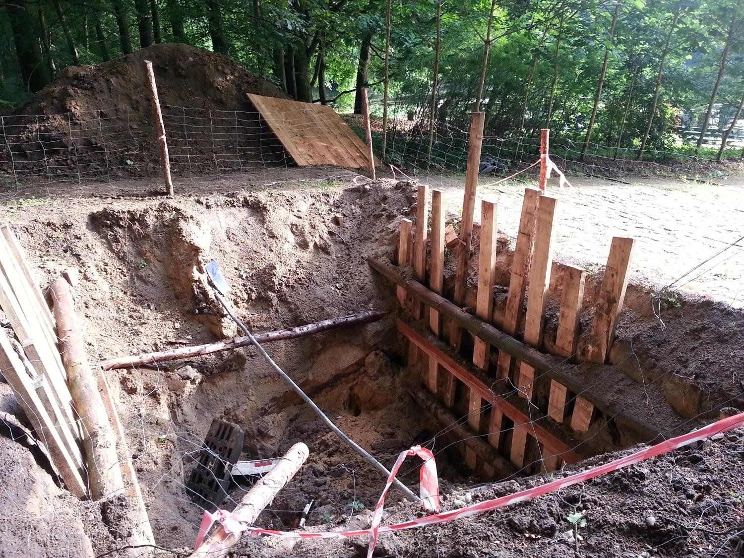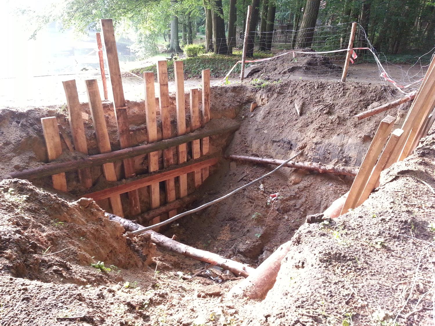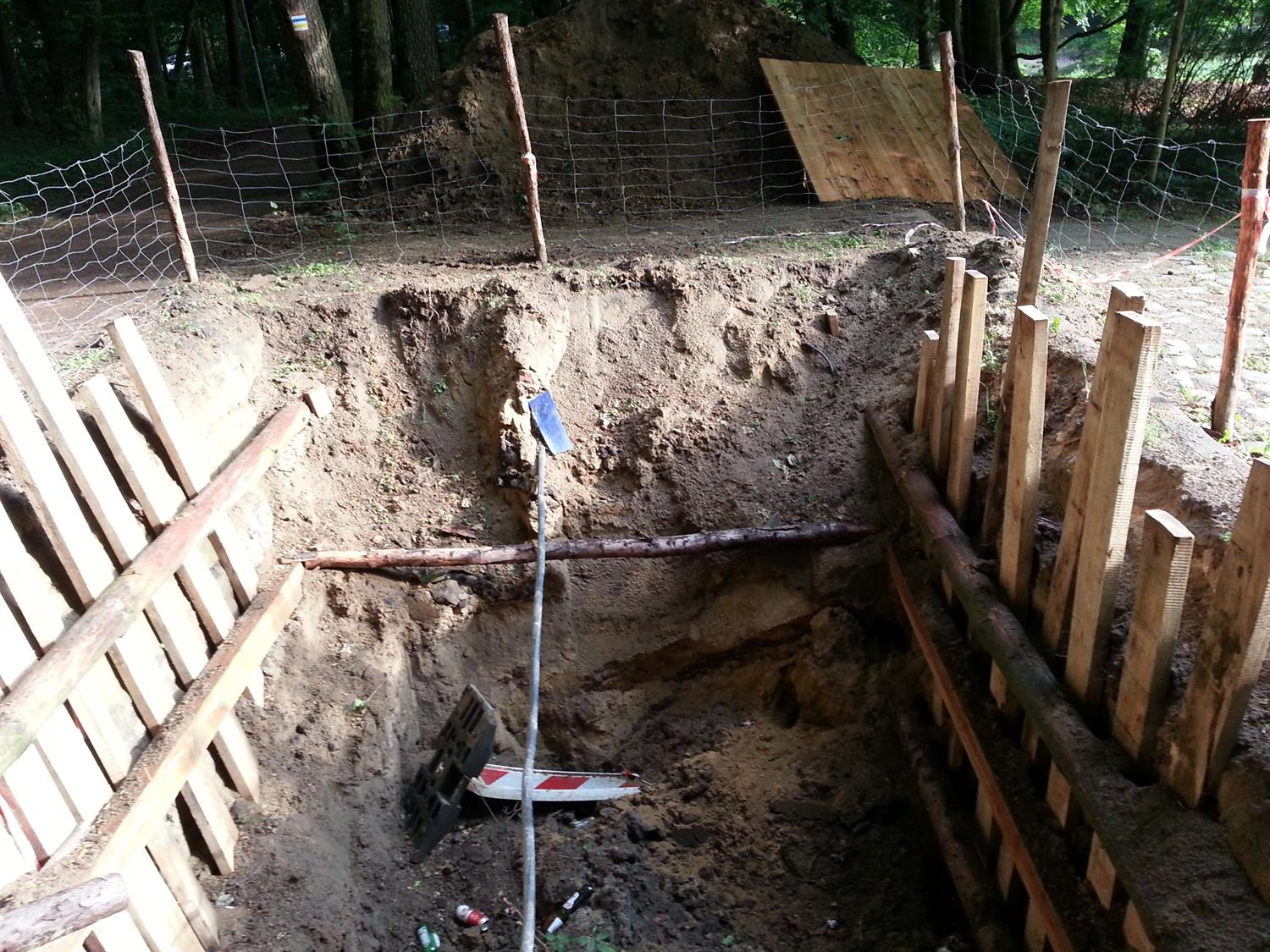 Jak na szczecińskie Głębokie przystało, są tam i głębokie wykopy. Tuż za pętlą na skraju lasu przy stawie Uroczysko można się natknąć na taki oto opłotkowany i osiatkowany wykop. Pisaliśmy o nim już w kwietniu. Jak wówczas ustaliliśmy, ta dziura to jednak nie dzieło poszukiwaczy skarbów. Najpierw zapadła się ziemia, a po odkopaniu okazało się, że rozszczelnił się rurociąg odprowadzający wodę z Uroczyska, zwanego też często stawem wędkarskim, do Jeziora Głębokiego.
