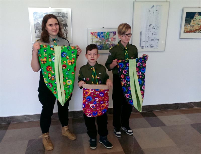 Na zdjęciu: Szlachetny dar dla poszkodowanych zwierząt. Paulina Siwkowska, Marcel Redzikowski i Michał Bierka prezentują torby, które zostały własnoręcznie wykonane przez grupę harcerzy.