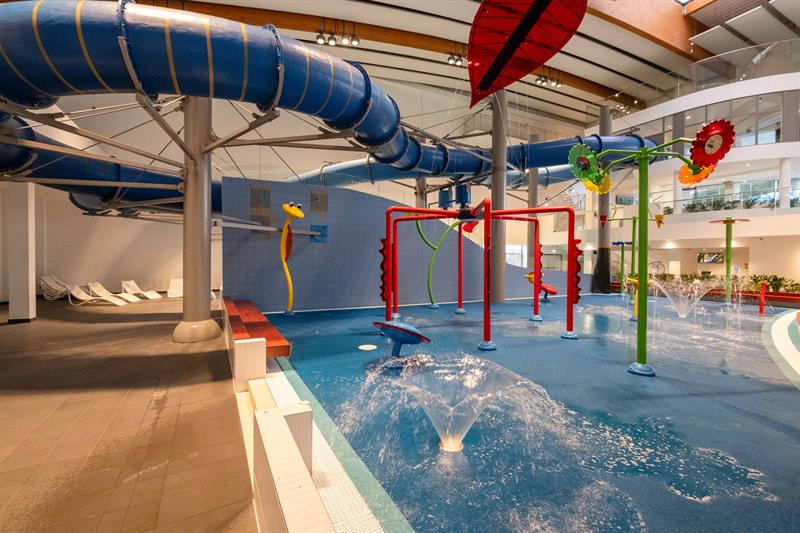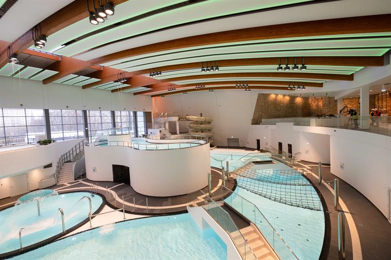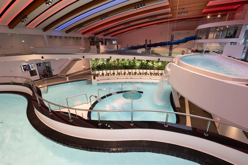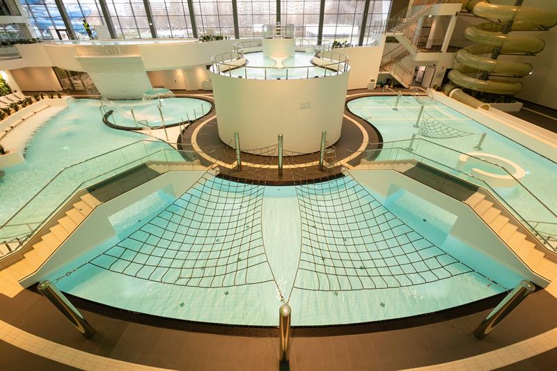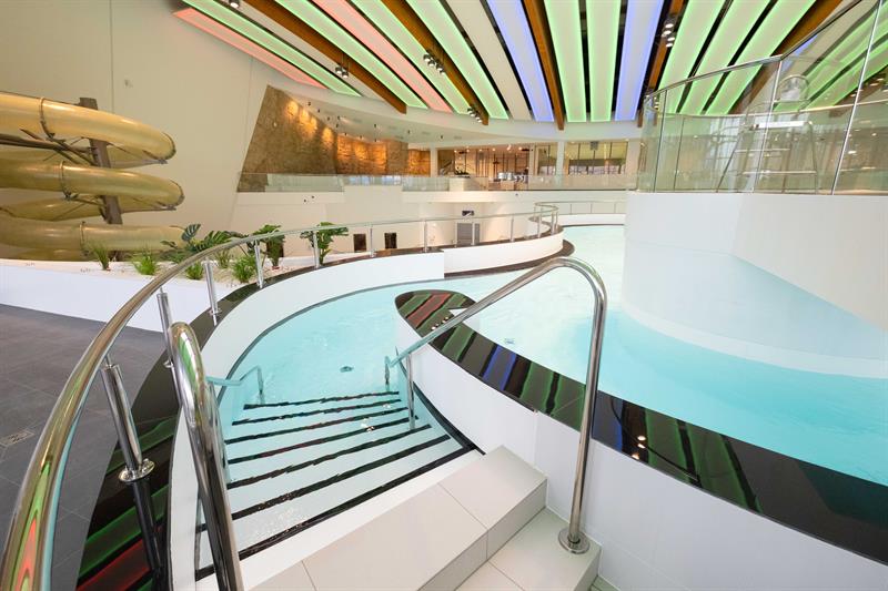 Część „wodna”, czyli ta, która oferuje różnego rodzaju baseny, składa się ze strefy rekreacyjnej i strefy sportowej. W pierwszej klienci będą mogli skorzystać z wymyślnych urządzeń wodnych: basenów, zjeżdżalni, jaskini wodnej (jedynej w tego typu obiektach w Polsce), kurtyn wodnych, strefy odpoczynku z leżakami, strefy z basenami dla małych dzieci i wielu innych. Dla osób, które preferują aktywność sportową, jest oddzielne pomieszczenie z basenem sportowym, który wyposażony jest w mobilne dno. Oznacza to, że można zmieniać jego głębokość. Będzie to także miejsce na zajęcia z nauki pływania czy aqua aerobiku.