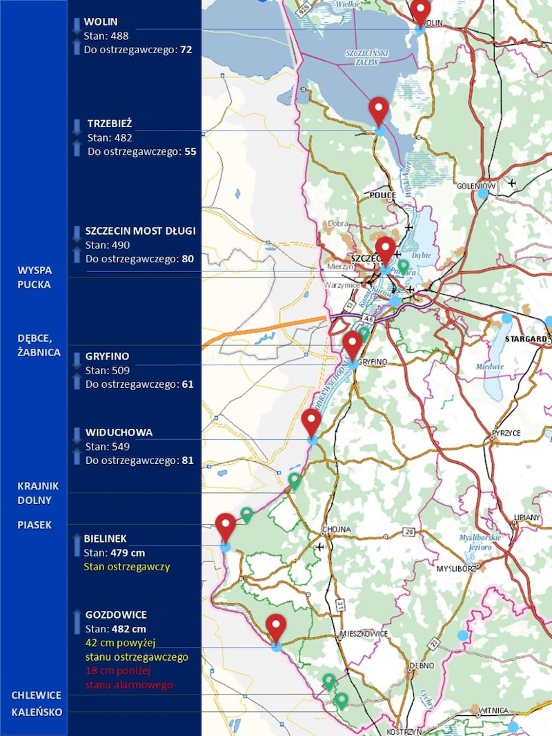 W Szczecinie wybudowano wał przeciwpowodziowy wzdłuż ul. Beniowskiego od ul. Spedytorskiej w kierunku ul. Targowej. Dostarczono big bagi z workami z piaskiem do przepompowni ZWiK przy ul. Marynarskiej 2. Do przystani wędkarskiej przy ul. Marynarskiej 1 dostarczono piasek luzem i worki. Dodatkowo przygotowano 30 big bagów z workami z piaskiem. W czwartek w Szczecinie do zamieszkałych ogrodów działkowych zagrożonych zalaniem będzie dostarczany piasek i worki, zgodnie z zapotrzebowaniem.