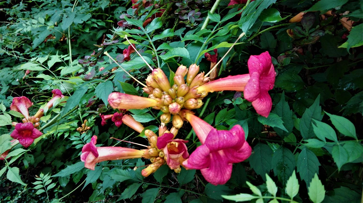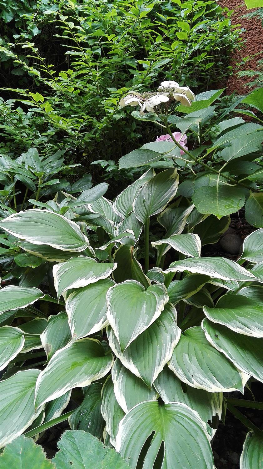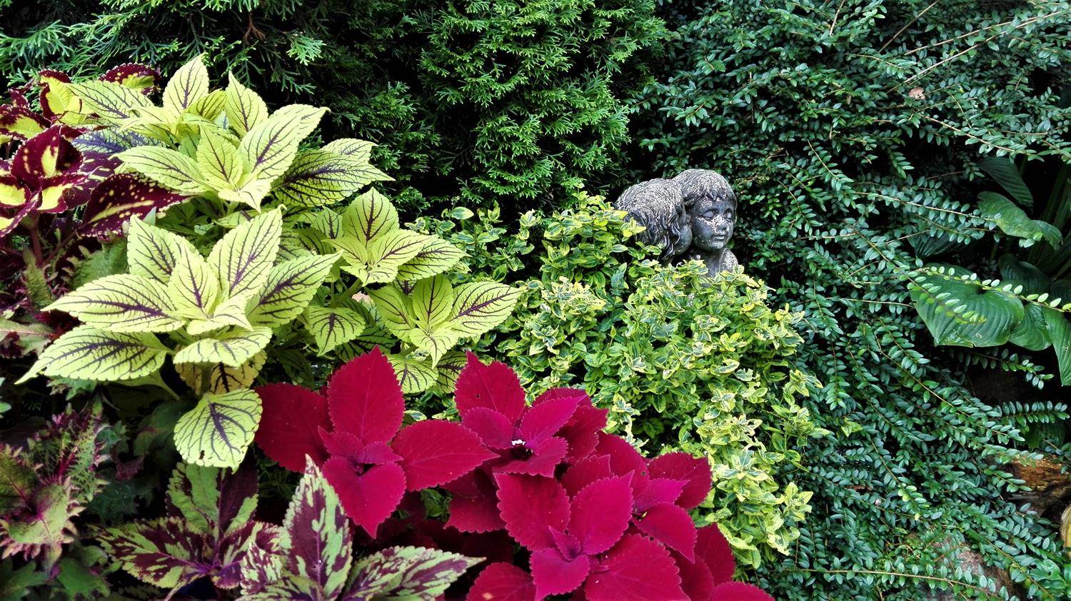 Na wejściu różnorodne hosty przeplatają się z hortensjami, begonie w amplach i odmianach - z pelargoniami. Tuż przy ozdobnej z liści akubie japońskiej ściele się rdest, oplatając gęstą czapą drewnianą huśtawkę. Dalej różaneczniki z dereniami są tłem dla irg, ostro- i suchodrzewu, dla strzelistego żywotnika i magnolii. Ścieżka zaś prowadzi ku kwitnącej pomarańczowej ścianie milinu amerykańskiego. Opodal również rozkwitają drobnymi kwiatami różnobarwne żurawki.