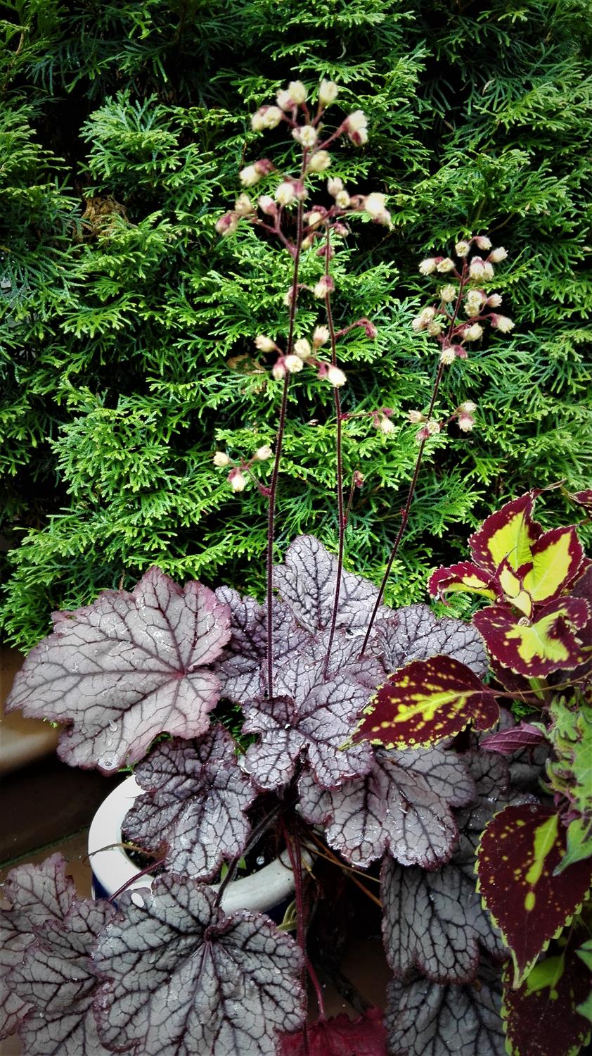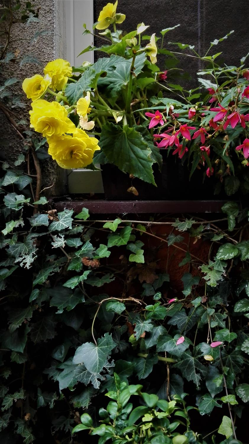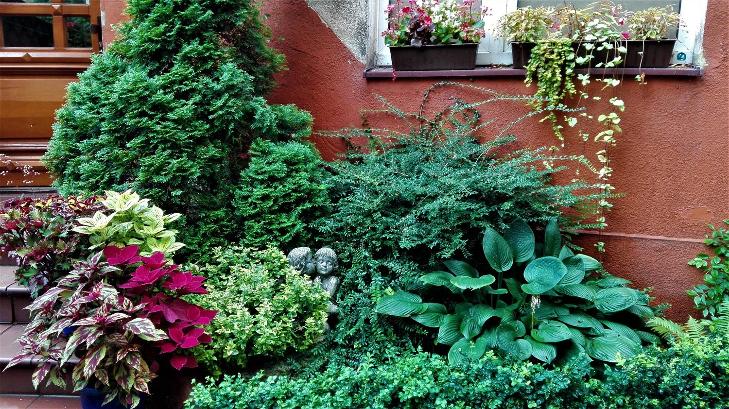 Tuż za pergolą, po której - zamiast dość oczywistych róż i powojników - pną się oryginalnie irgi i ogniki, są schody prowadzące ku oficynie. I one rozkwitają żółtymi i pomarańczowymi begoniami. Tu też stoją donice z efektownymi koleusami. Uwagę przyciągają kolejne bujnie rozkrzewiające się ligustry, trzmieliny i żywotniki, a także hosty, bukszpany. A przede wszystkim spojone morze runianki japońskiej oraz bluszczu, co nie tylko pnie się zielonym dywanem pomiędzy oknami aż po czwarte piętro, ale też wypływa na kamienne „pole" z glinianego dzbanu.