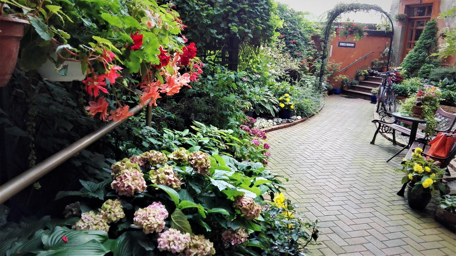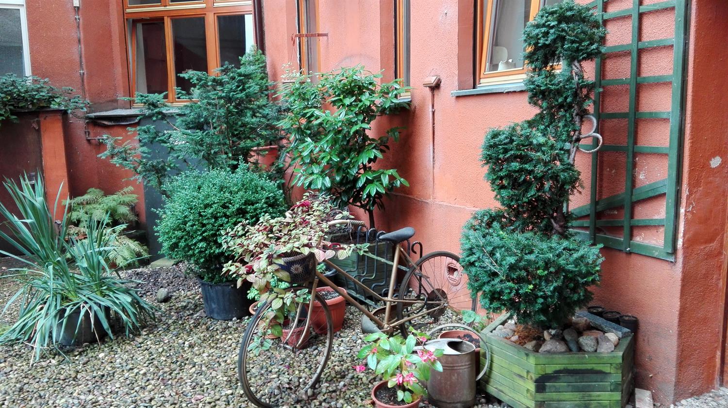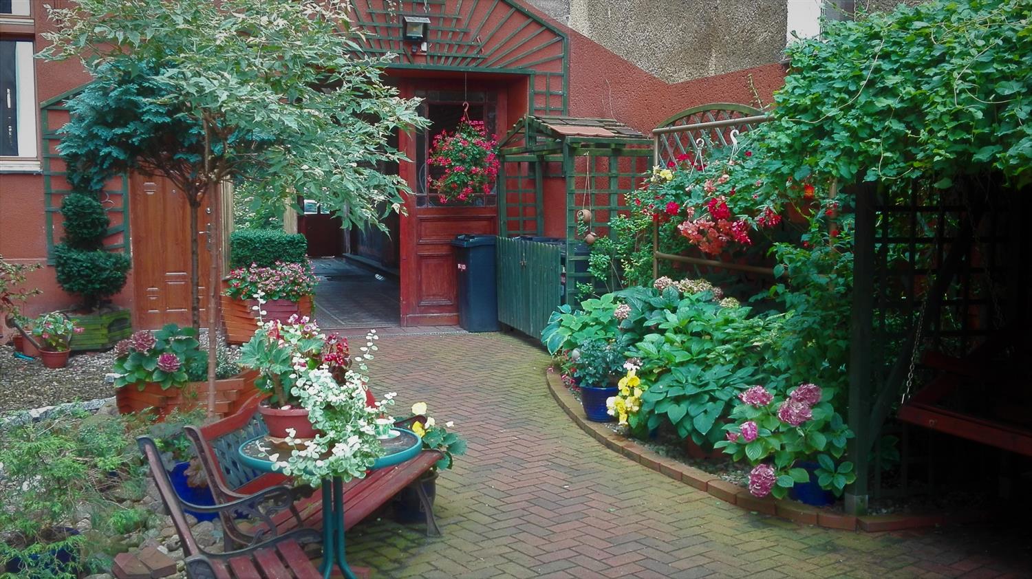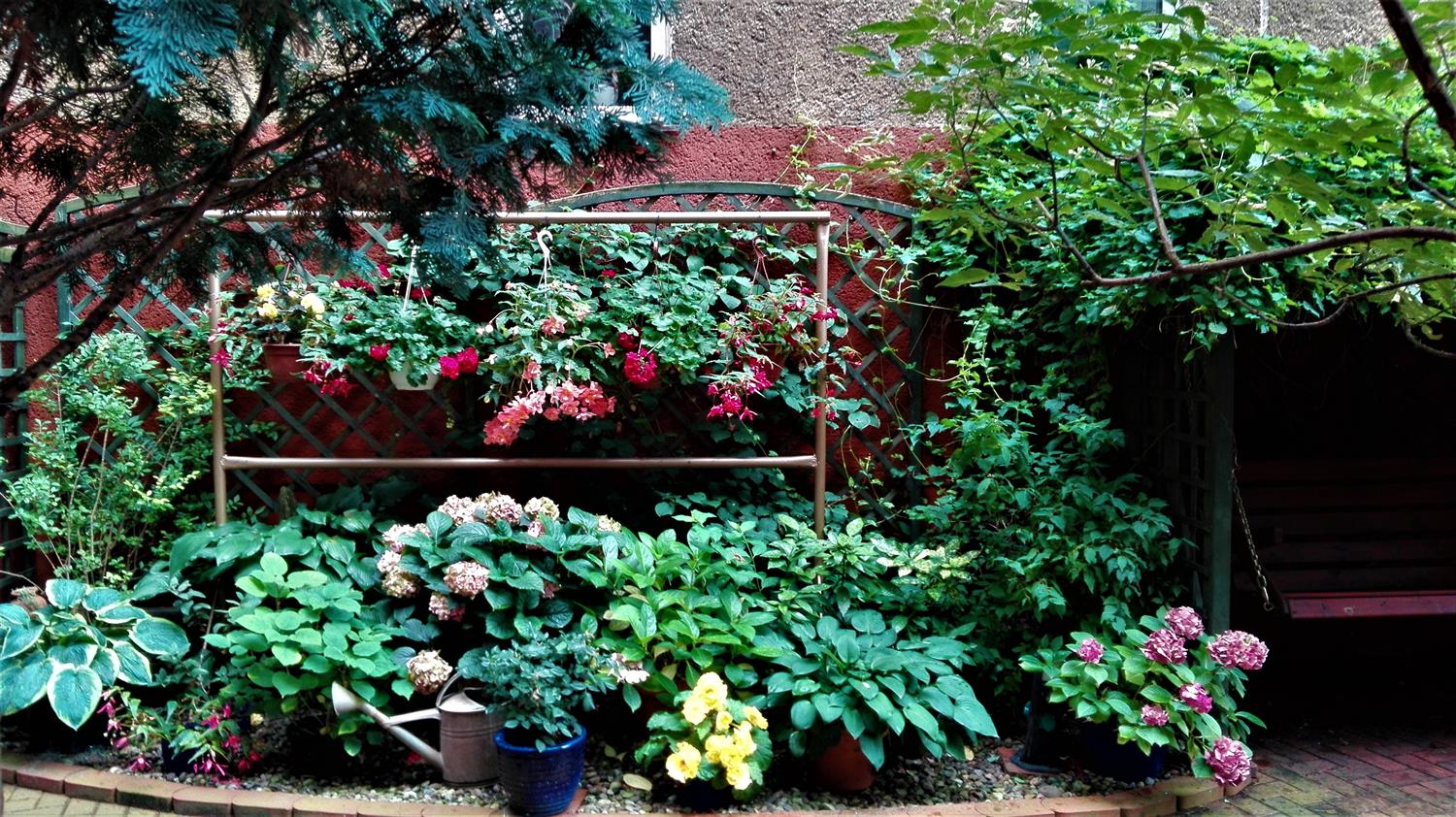 Dziedziniec pomiędzy frontem a oficyną, ograniczony murami garaży oraz sąsiedniej kamienicy. Miejsce, do którego słoneczne promienie docierają ledwie na parę godzin - nie więcej niż trzymetrowym pasem błądząc po roślinach. Teraz to zielona oaza, rozświetlana feerią kwiatowych barw. Niezwykła przemiana z niegdysiejszego podwórka-studni na tyłach szarych murów zaniedbanych przedwojennych kamienic, jakich nie tylko przy al. Papieża Jana Pawła II (d. Jedności Narodowej) wciąż nie brakuje.