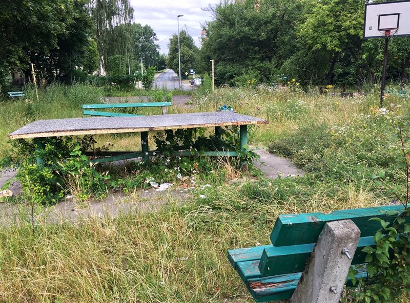 W najgorszym stanie są urządzenia placu zabaw. Bo na tyle uszkodzone, że zagrażają bezpieczeństwu najmłodszych. Ławki też są zdewastowane i toną w chaszczach. Podobnie jak przepełnione kosze na śmieci, z których wysypują się puszki i butelki po alkoholu. Niegdysiejszy stół do ping ponga służy teraz - jak przyznaje nasza Czytelniczka - głównie za biesiadny. Natomiast boiska do gier sportowych tylko dlatego jeszcze nie wchłonęła tamtejsza „spontaniczna łąka", że ma ono asfaltową nawierzchnię: wprawdzie nieprzepuszczalną, ale - jak widać - nie wandaloodporną.