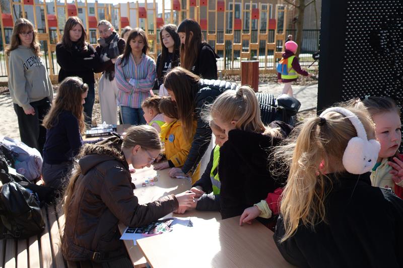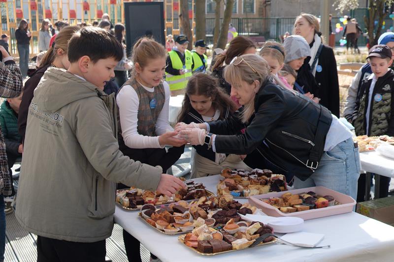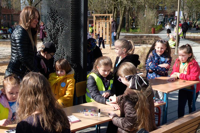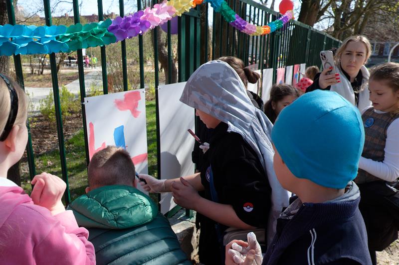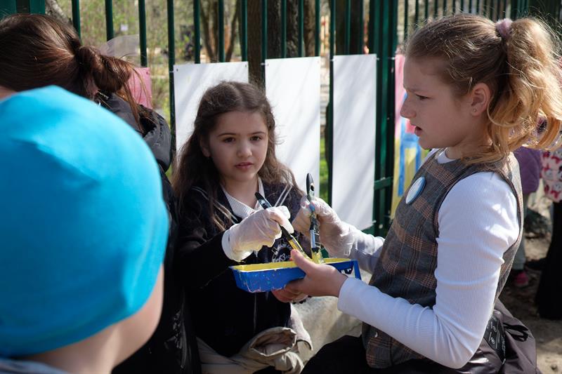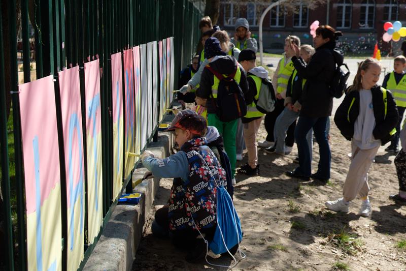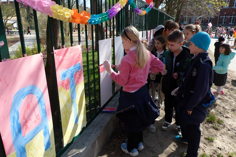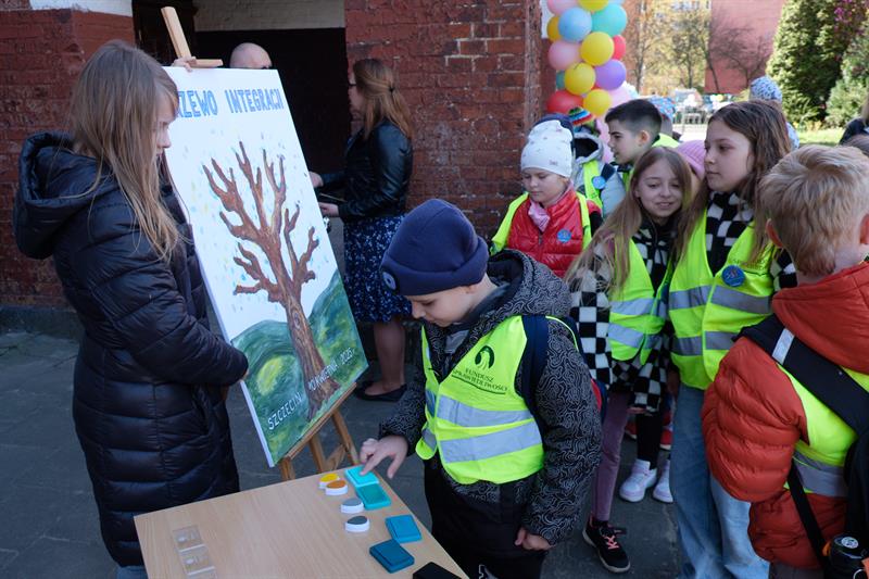 Podczas festynu w SP41 z OI uczniowie wspólnie stworzyli niezwykły obraz - Drzewo Integracji – na którym po odciśnięcia na płótnie umoczonych w farbie dziecięcych palców pojawiły się liście.