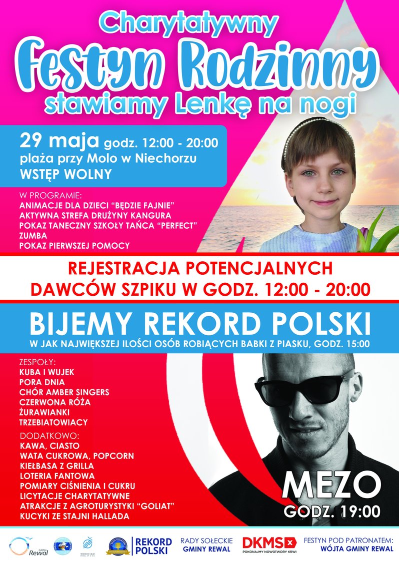 W niedzielę o g. 12 na molo w Niechorzu rozpocznie się 8-godzinny festyn rodzinny, na którym odbędzie się rejestracja potencjalnych dawców szpiku kostnego dla 9-letniej Lenki, mieszkanki pobliskiego Lędzina. Impreza połączona będzie z występami zespołów tanecznych, ludowych, animacjami dla dzieci, pokazami udzielania pierwszej pomocy pomiarami ciśnienia i mierzenia poziomu cukru we krwi. O godz. 15 zacznie się konkurs na „wypieczenie” maksymalnej ilości babek z piasku.