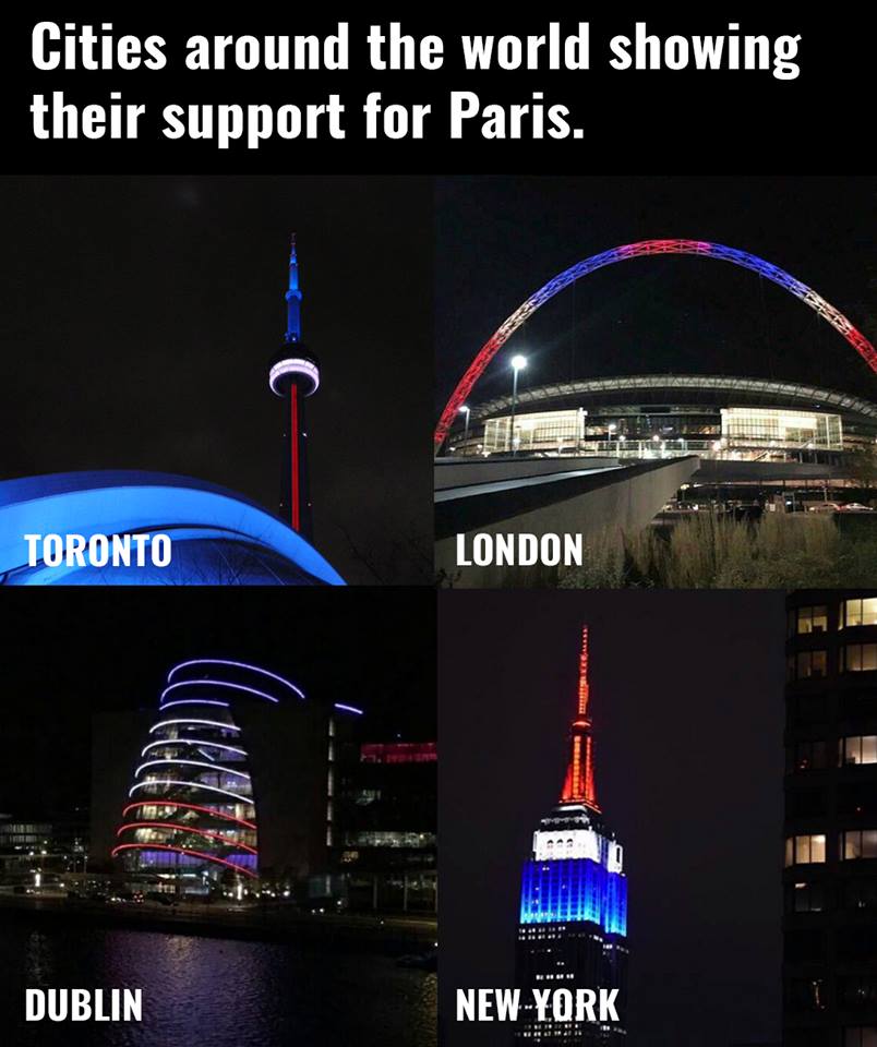 Po piątkowych wydarzeniach, swoje wsparcie dla francuskiej stolicy wyraziło wiele miast świata, podświetlając swoje centralne punkty: Tower Bridge i stadion Wembley w Londynie, operęw Sydney, posąg Chrystusa w Rio de Janeiro. W Polsce do akcji włączyły się m.in. Kraków i Warszawa.