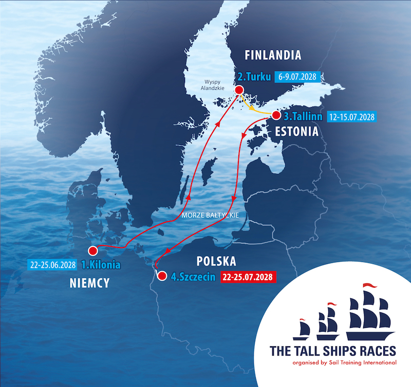 Trasa TSR 2028 została wyznaczona na dwa etapy oraz jeden rejs przyjaźni i będzie przebiegać następująco: Kilonia (22 czerwca – 25 czerwca) – Turku (6 lipca – 9 lipca) – Tallinn (12 lipca – 15 lipca) – Szczecin (22 lipca – 25 lipca). Fot. Żegluga Szczecińska Turystyka Wydarzenia Sp. z o. o.