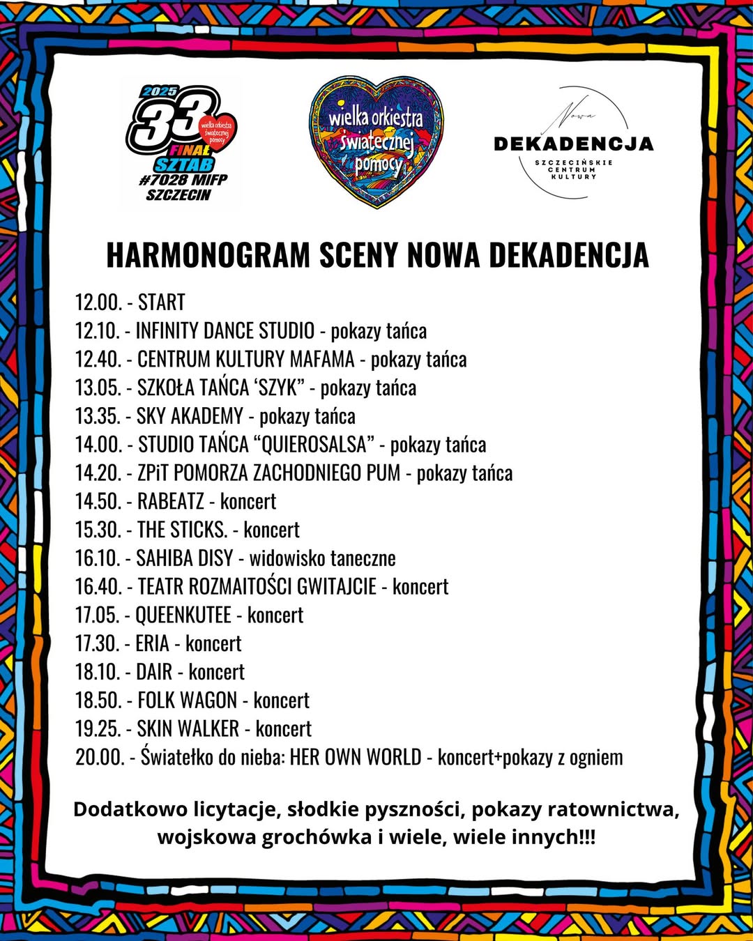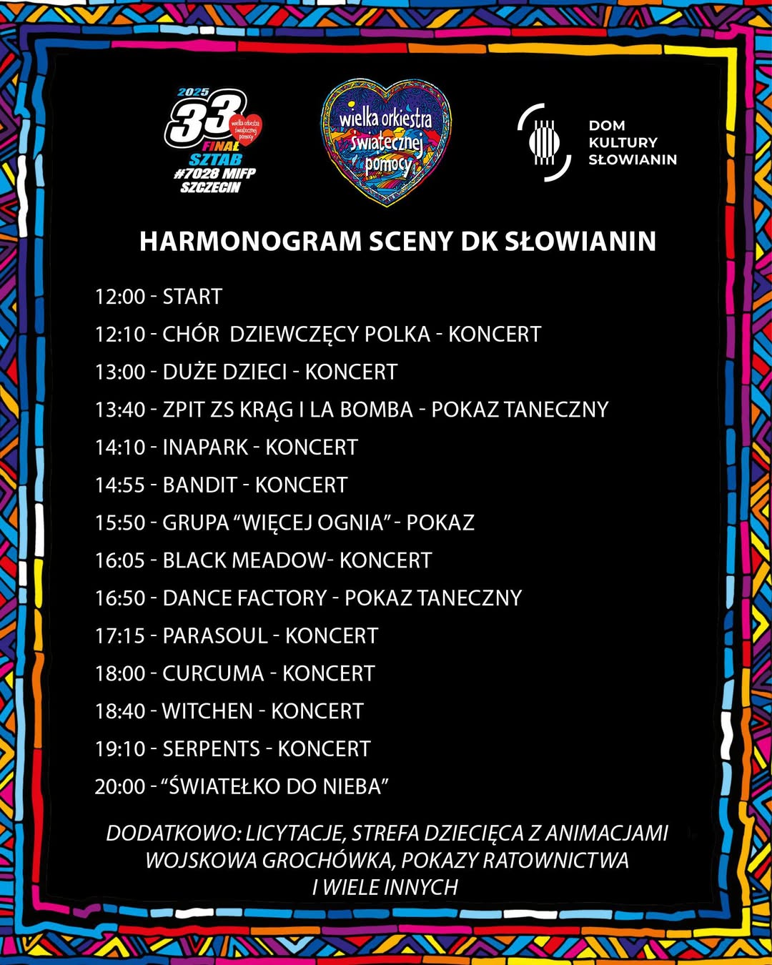 Po raz kolejny szczeciński Finał WOŚP odbędzie się też na dwóch scenach: Domu Kultury Słowianin oraz Nowej Dekadencji – Szczecińskiego Centrum Kultury. Zapowiedziano liczne koncerty, występy i pokazy lokalnych i regionalnych artystów, a wszystko to przeplatane licytacjami. Sporo atrakcji szykuje CHR Galaxy – w programie m.in. występy muzyczne i taneczne, pokazy tresury psów, nauka udzielania pierwszej pomocy, zabawy dla dzieci, spotkania z koszykarzami King Wilki Morskie i siatkarkami Chemika Police, licytacje, a o godz. 20 „Światełko do Nieba”. Po raz czwarty Północna Orkiestra Szczecina zagra dla WOŚP na Stołczynie. Wydarzenie odbędzie się w OKS Hutnik Szczecin, potrwa w godz. 14-17 przy ul. Nehringa 69.
