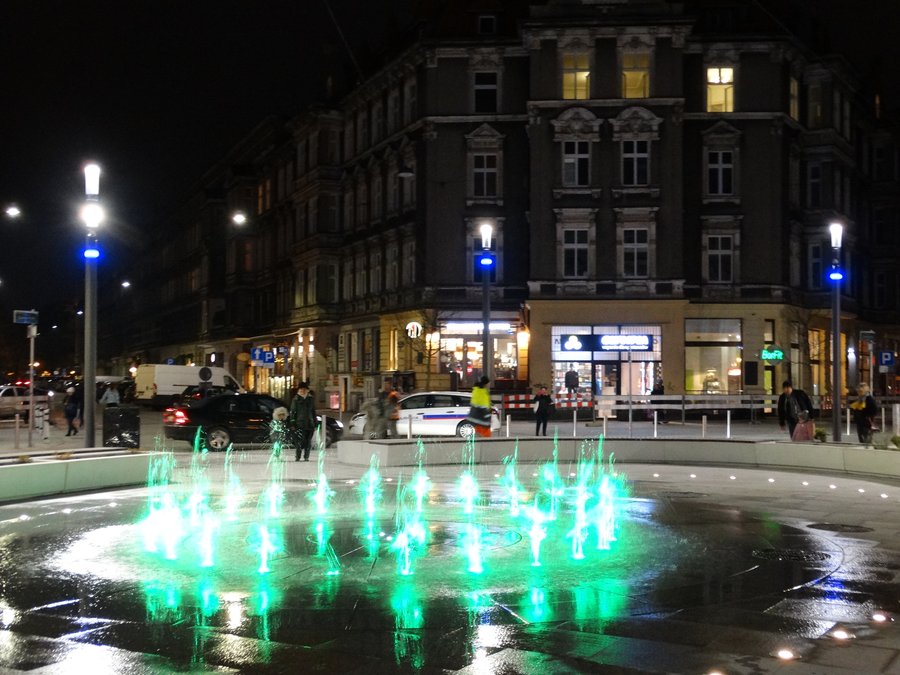 Na zdjęciu: tak w czwartek wieczorem wyglądała podświetlona fontanna na ul. Jagiellońskiej.