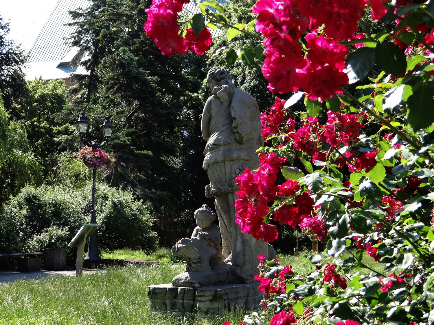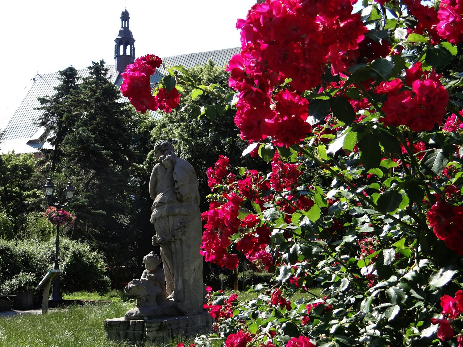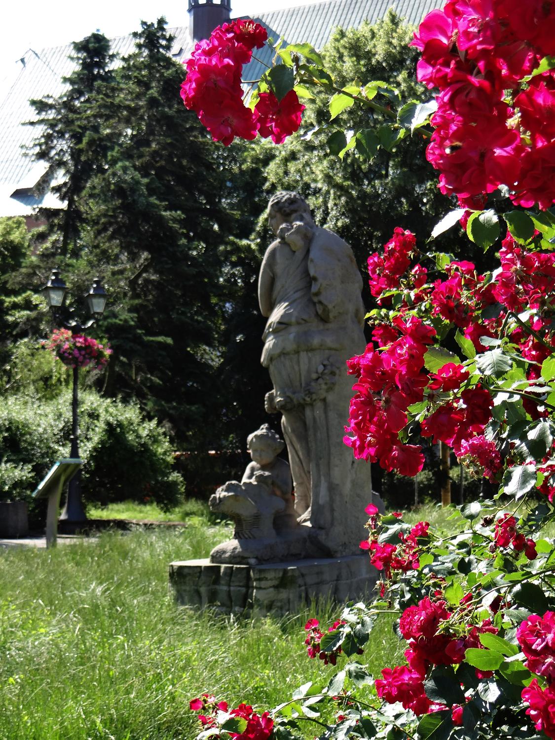 Plac Orła Białego od lat wymaga rewitalizacji. Jednak jego zieleń - niezmiennie zachwyca. Szczególnie teraz, gdy wokół rzeźby Flory rozkwitł różany parawan. Dzieląc przestrzeń placu na rekreacyjną i - wciąż jeszcze - parkingową.