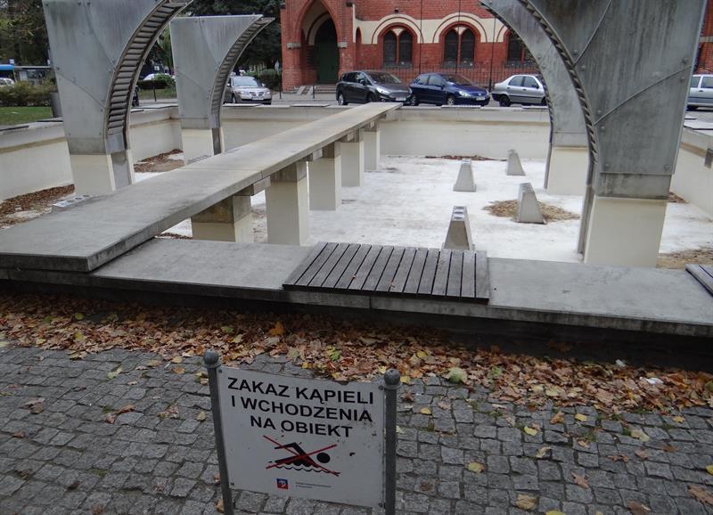 Zakład usług Komunalnych, poszukując wykonawcy prac, do realizacji wskazał również wykonanie powłok wykończeniowych dna i ścian niecki, podpór kładki oraz pylonów, oczyszczenie, naprawę i konserwację parapetów wraz z siedziskami oraz kładki. Także: „demontaż, oczyszczenie, zabezpieczenie oraz ponowny montaż tafli szklanych zamontowanych na pylonach wraz ze zmianą sposobu ich montażu poprzez zastosowanie zawiasów".