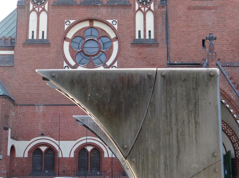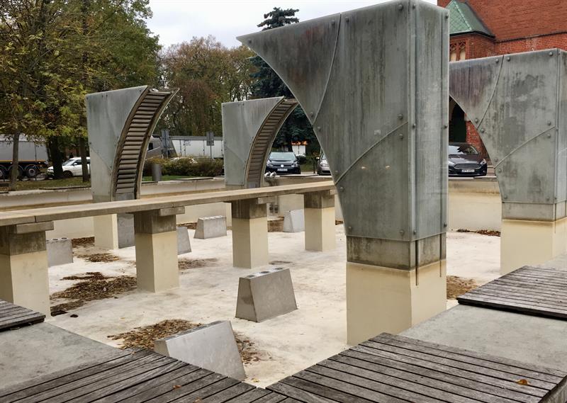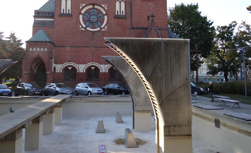 To jedna ze sztandarowych realizacji zamiany basenów przeciwpożarowych w fontanny. Zrealizowana w 2012 r. Jak wówczas zakładano, woda tryskająca z dysz zamocowanych na pylonach „utworzy bramy, pod którymi każdy będzie mógł przejść po kładkach" zamontowanych tuż nad powierzchnią tafli basenu. Szybko się okazało, jak nierealna była to wizja. Tym bardziej że pierwotnie (przez ówczesne Biuro Promocji i Informacji UM) adresowana do nowożeńców i ich gości, po uroczystości opuszczających sąsiedni kościół garnizonowy.