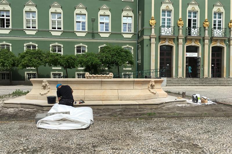 Oczyszczenie, uszczelnienie mis, usunięcie fug starych i założenie nowych, a też uzupełnienie wszelkich ubytków w kamieniu oraz „uszczelnienie" go przeciwko wnikaniu wody i zawilgoceniu - na tym polegają kompleksowe prace konserwatorskie, jakie w dwóch fontannach przed szczecińskim magistratem, na pl. Armii Krajowej, wykonuje specjalistyczna firma z Torunia.