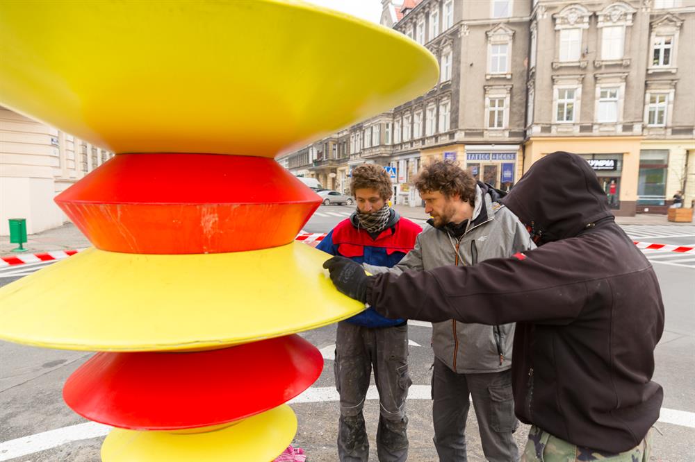 Plenerową rzeźbę Maurycego Gomulickiego, ustawiono na placu Zamenhofa pod koniec października. Siedmiometrowa i siedmiotonowa konstrukcja, wykonana została z polimerobetonu, materiału mającego zapewniać jej wytrzymałość. Po miesiącu, pęknięcia i uszkodzenia na poszczególnych elementach widać było gołym okiem, a Damian Rożynek, wykonawca „Frygi", wyjaśniał, że kolorowe dyski uszkodzono podczas montażu. Informował także, że konstrukcja ma charakter prototypowy, korale trzeba było złożyć z dwóch części, sklejonych ze sobą na całej wewnętrznej powierzchni.