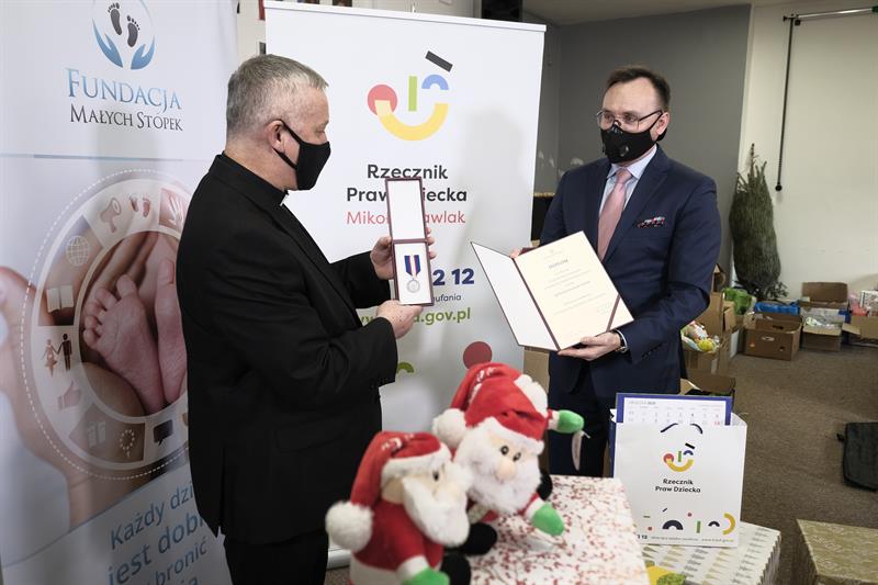 Szczecińska Fundacja Małych Stópek, którą kieruje ks. Tomasz Kancelarczyk (na zdjęciu z lewej), otrzymała honorową odznakę od Mikołaja Pawlaka, Rzecznika Praw Dziecka (na zdjęciu z prawej).