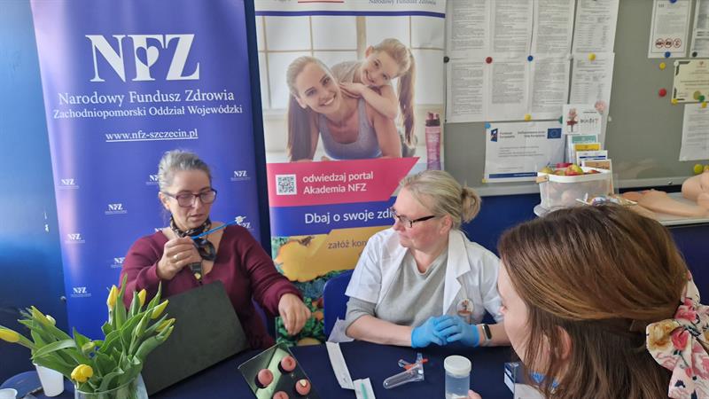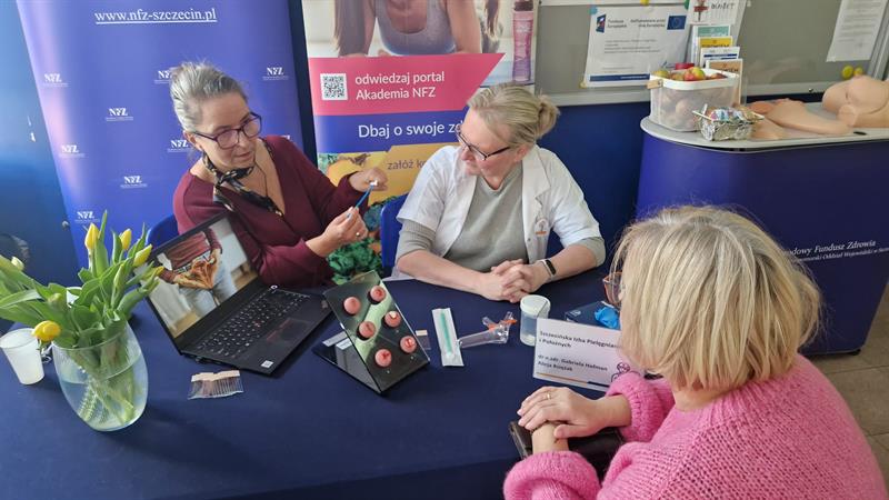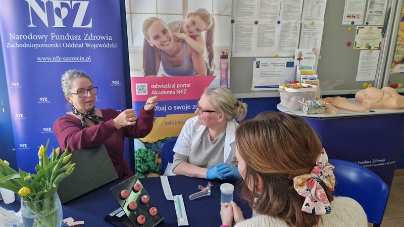 Tuż przed Dniem Kobiet Zachodniopomorski Oddział Narodowego Funduszu Zdrowia zaprosił do swojej siedziby przy ul. Arkońskiej w Szczecinie specjalistki, które przypominały, odwiedzającym w tym dniu urząd, paniom, że warto regularnie wykonywać badanie cytologiczne. Bo jak przypomina NFZ „Piękno zaczyna się od zdrowia. Dbaj o siebie każdego dnia”. Oczywiście to była też dobra okazja do przećwiczenia badania piersi na fantomach, porozmawiania o innych programach profilaktycznych skierowanych do kobiet i zdrowym odżywianiu.