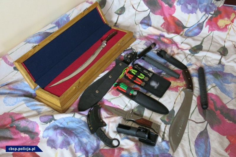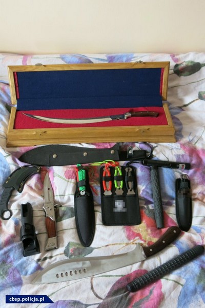 Na zdjęciu: Zabezpieczone zostały noże, maczety, pałki teleskopowe, skiery oraz paralizator.
