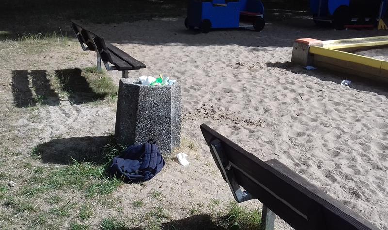 Tym razem martwych konarów wielkiego drzewa, zwisających nad jedną ze ścieżek spacerowych. Także placu zabaw, na którym razi nie tylko brudny piach, ale również śmieci dosłownie wysypujące się z przepełnionych koszy.