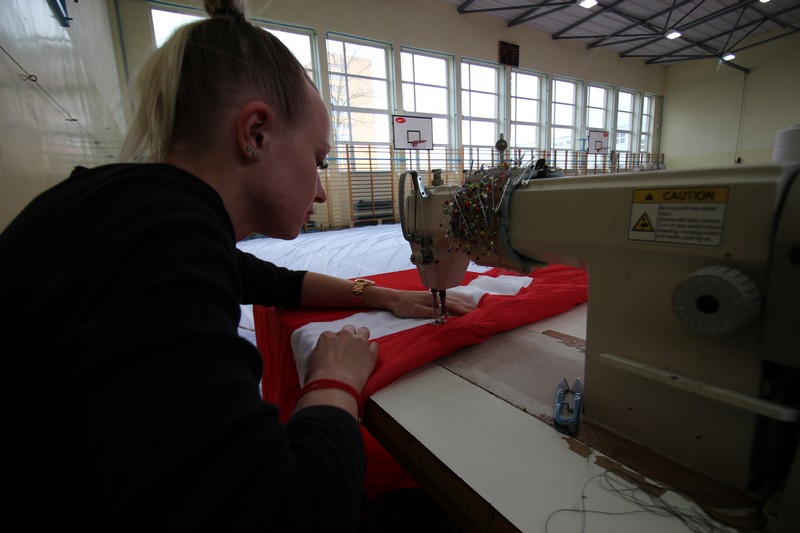 Flagę szyły trzy osoby: Ewa Nowakowska, jej mąż Sławomir Nowakowski oraz Nadia. Studio Krawieckie ma już doświadczenie w szyciu wielkich flag. Jest to już czwarta flaga uszyta przez nich na Święto Flagi. Za pierwszym razem biało-czerwona miała 300 metrów kwadratowych. Z roku na rok była coraz większa. Ta jest największa. Udało się pobić rekord Greków o kilkadziesiąt metrów.