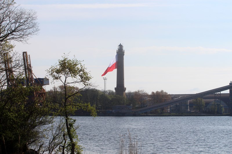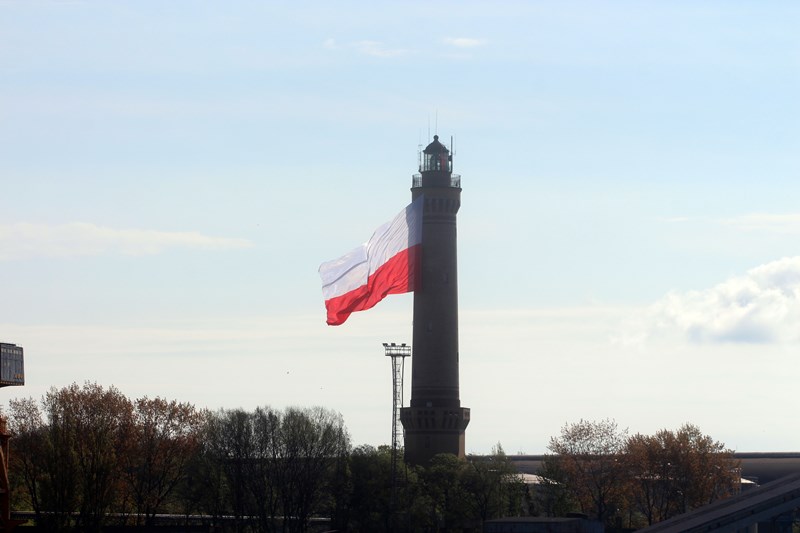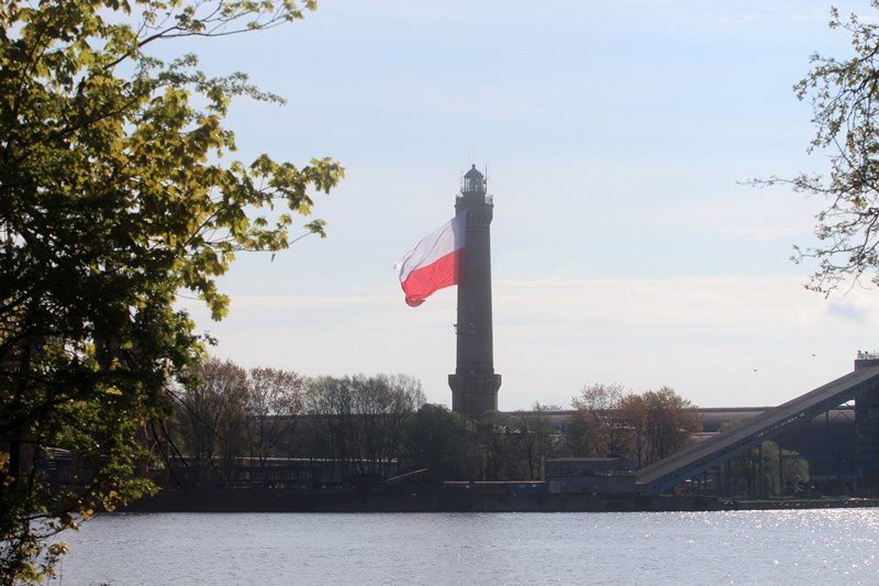 Na zdjęciu: Tak wygląda wielka flaga na latarni morskiej w Świnoujściu.