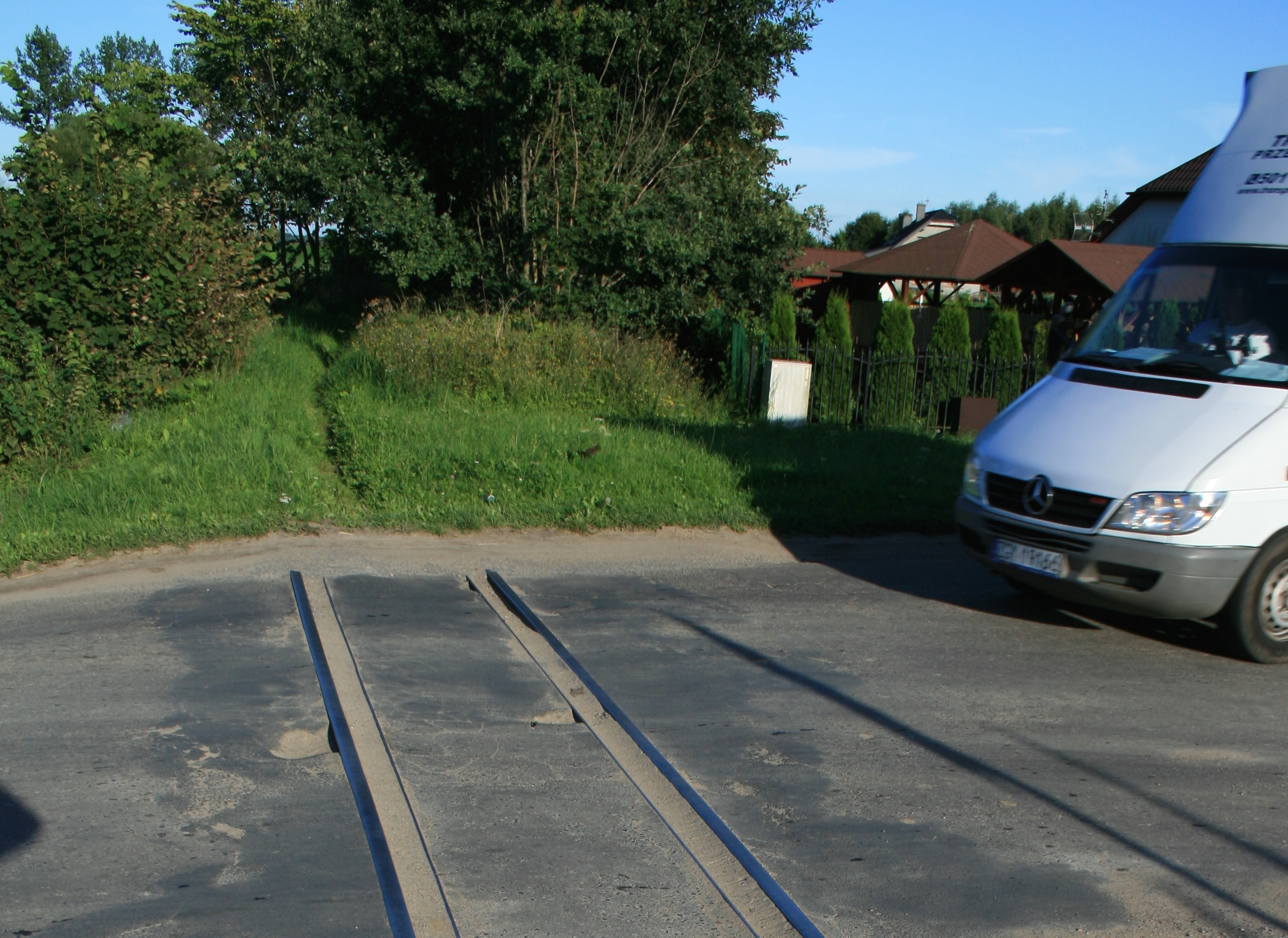 Tory, z których od lat nikt nie korzysta, wystają znacznie ponad jezdnię i działają na opony samochodowe jak gilotyna. Jak widać, między nimi jest spadek terenu i zwyczajne dziury. Kilkadziesiąt metrów dalej, poza jezdnią, tory są zasypane piachem i zarośnięte trawą oraz drzewami. Na pewno, nawet gdyby ktoś chciał „poprowadzić” kolejkę do Trzebiatowa (pomarzyć zawsze można), to i tak by wybudowano nowe torowisko.