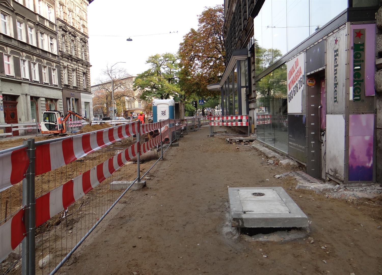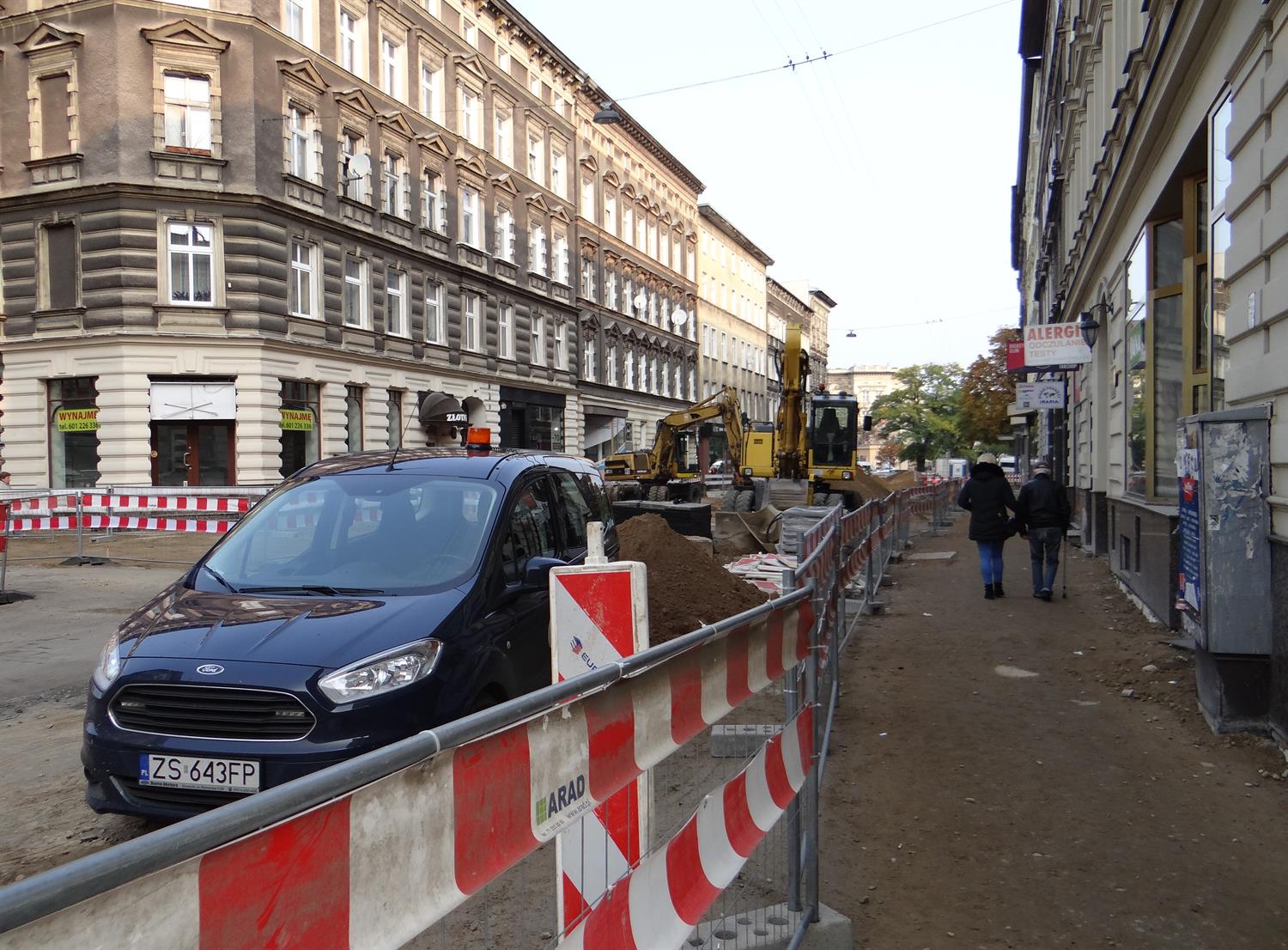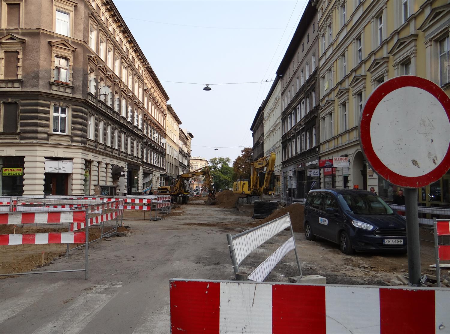 Na zamkniętym od trzech tygodni dla ruchu krótkim odcinku ul. księcia Bogusława X między pl. Zgody i ul. Andrzeja Małkowskiego w Szczecinie trwają roboty ziemne. Po rozbiórce starych chodników i skuciu zdewastowanej nawierzchni jezdni wykonywane są teraz wykopy pod nową infrastrukturę techniczną w tym rejonie. W ślepym zaułku przyległej ul. Andrzeja Małkowskiego (dochodzącym do budynku dawnego kina Kosmos) prace jeszcze się nie rozpoczęły. A skrzyżowanie obu tych ulic dla aut jadących od ul. Bolesława Krzywoustego w kierunku ul. bł. Królowej Jadwigi pozostaje na razie przejezdne.
