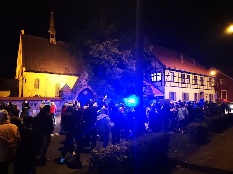 To już drugi protest na ulicach Myśliborza. Ten pierwszy, w sobotę, zgromadził nieco tylko mniejszą liczbę mieszkańców. Protestujący chodzili ulicami miasta i skandowali m.in. „Konstytucja jest kobietą”. Protestujący wzięli ze sobą gwizdki, wuwuzele, race oraz wieszaki. Niektóre zawisły na miejscowej plebanii, a inne na płocie przy siedzibie PiS.
