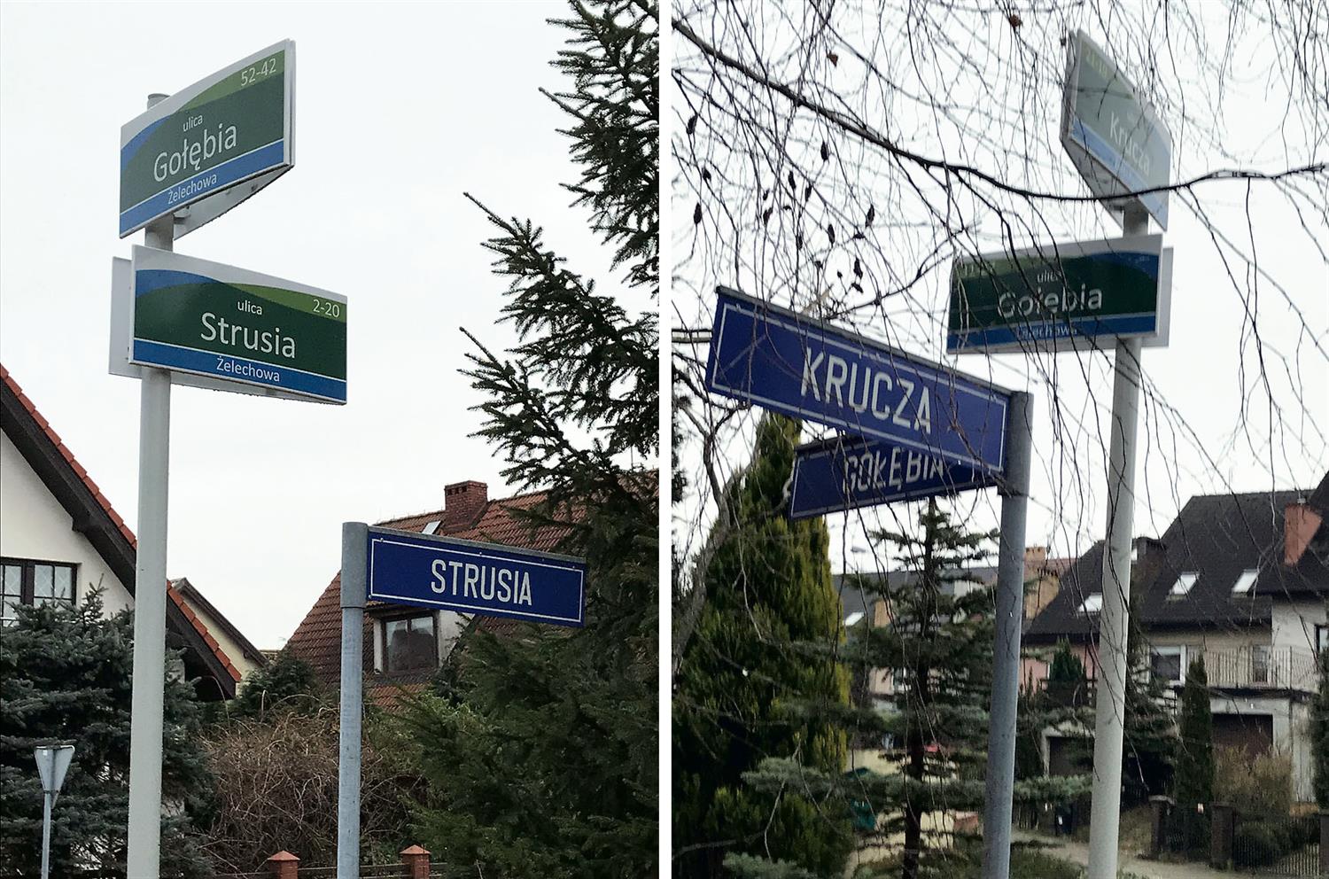 Stare szyldy, na których nazwy ulic napisano białymi literami na niebieskim tle, były w dobrym stanie. Zapewne mogłyby jeszcze posłużyć przez kilka czy kilkanaście lat. Przed kilkoma dniami obok starych słupków pojawiły się nowe, nieco wyższe, a na nich zawieszono tabliczki w barwach floating garden. Jedyną zaletą nowych znaków jest to, że słupki są wyższe, zatem umieszczone na nich szyldy będą bardziej odporne na działania wandali.