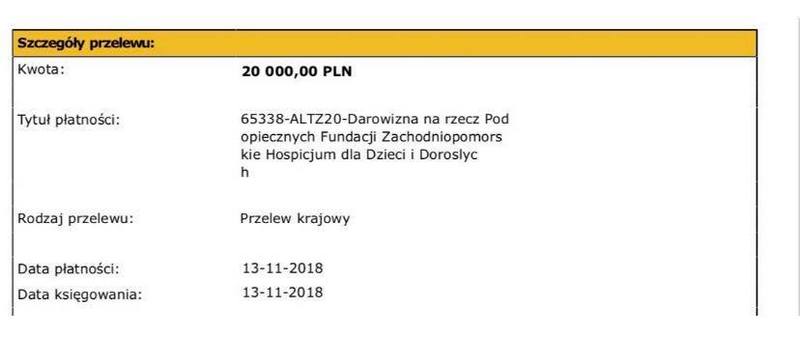 Reakcja sportowca była równie konkretna. Przelał na konto hospicjum nie tysiąc dolarów, jak deklarował, a ponad 5,5 tys., czyli 20 tys. złotych. Tyle ile potrzeba na asystor.