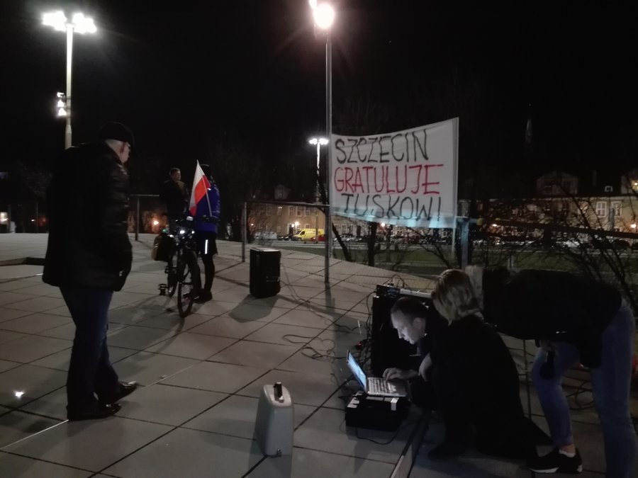 W piątek 10 marca wieczorem na pl. Solidarności w Szczecinie spotkali się członkowie i sympatycy KOD. Kilkadziesiąt osób maszerowało wokół placu, gratulując Donaldowi Tuskowi ponownego wyboru na przewodniczącego Rady Europejskiej. Przy rozwieszonym transparencie " Szczecin gratuluje Tuskowi" uczestnicy spontanicznego, jak podkreślano, spotkania z flagami unijnymi i polskimi, przy dźwiękach m.in. "We are the champions" zespołu Queen, trąbek i gwizdków, radowali się z wyborczego wyniku "27:1" .