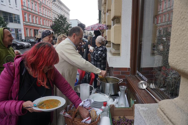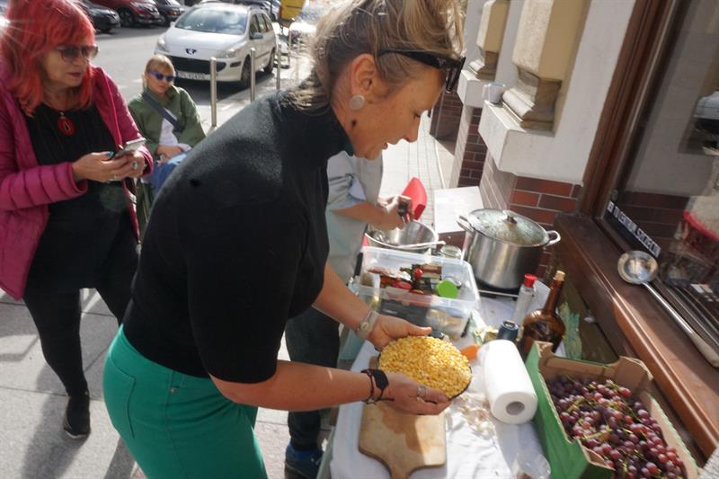Wspólne gotowanie zaczęło się w samo południe i to na wolnym powietrzu. Z początku jedną z głównych kucharek była Renata Ramola – szczecińska artystka, której tworzywem twórczym jest głównie tkanina. Tym razem były to warzywa użyte do zupy.