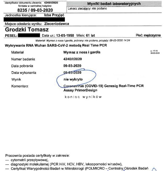"W poczuciu odpowiedzialności poddałem się badaniu na obecność koronawirusa i upubliczniam jego wynik. Wzywam Adama Bielana (rzecznika sztabu prezydenta Andrzeja Dudy - przyp. red.), by nie siał paniki i nie odwracał uwagi od problemów własnego obozu politycznego w kampanii prezydenckiej"- napisał w poniedziałek na Twitterze marszałek Senatu, Tomasz Grodzki. Marszałek upublicznił również swój wynik badania, na którym widnieje informacja: "nie wykryto".