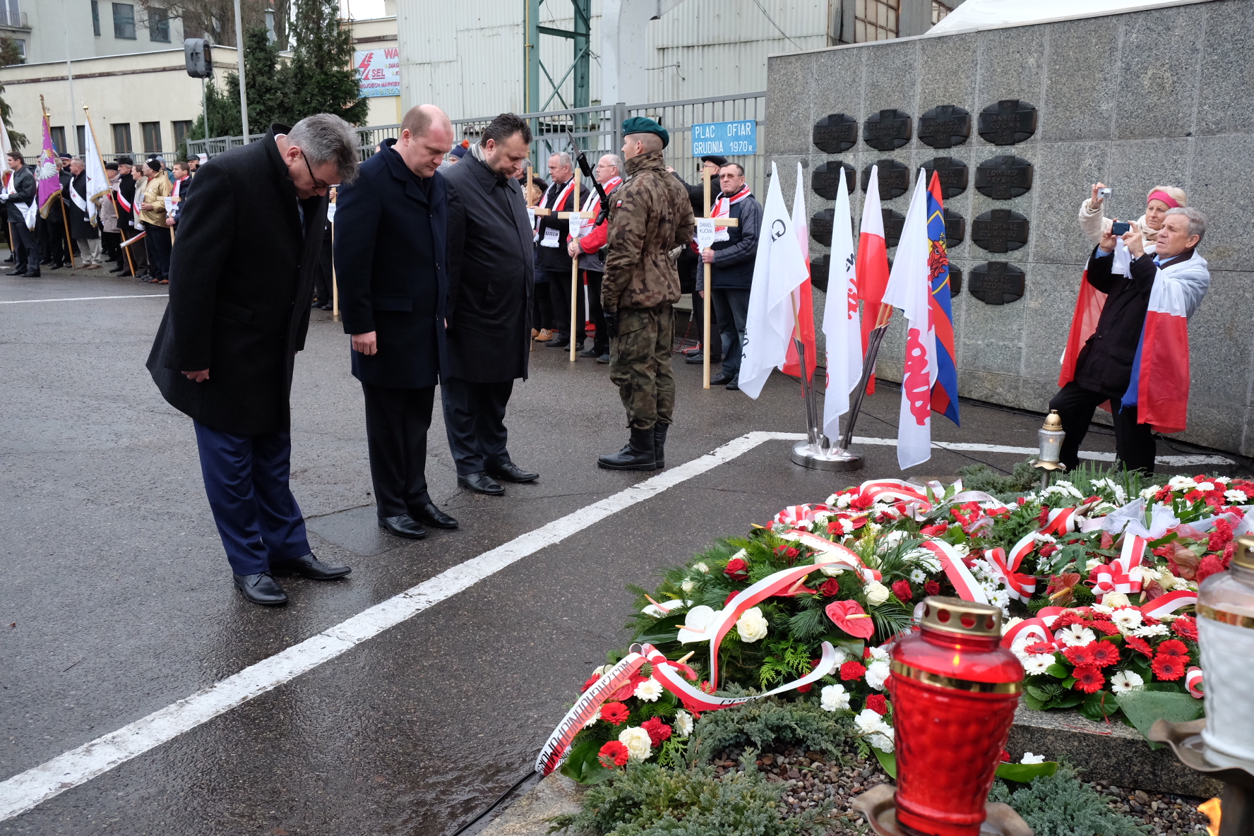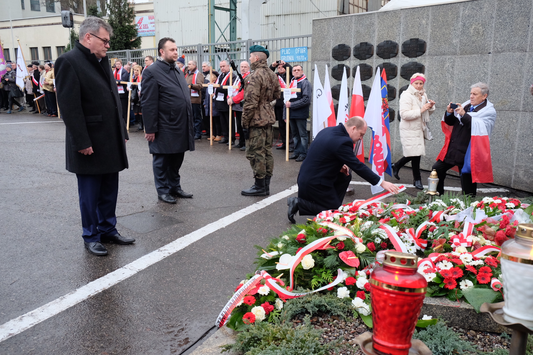 Po złożeniu wiązanek kwiatów pod tablicą upamiętniającą ofiary wydarzeń grudniowych uczestnicy uroczystości przeszli w pochodzie na plac Solidarności.