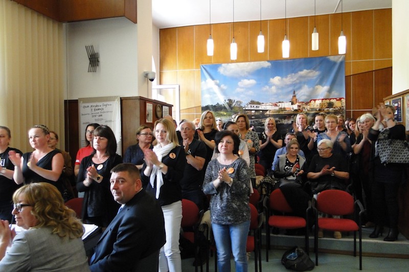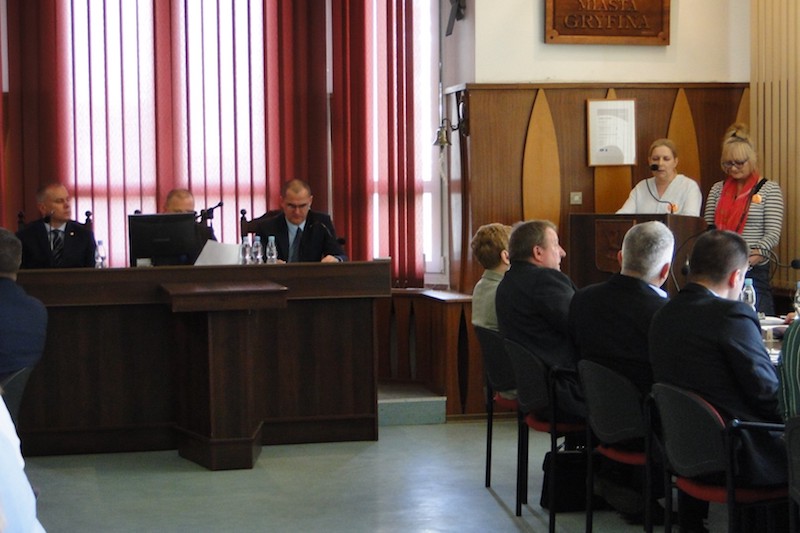 Na czwartkowej (25 kwietnia) sesji Rady Miejskiej w Gryfinie pojawiła się duża grupa pracowników oświaty. Przyszli, bo oburzyły ich wypowiedzi włodarzy m.in. opublikowane w lokalnej prasie a także wygłaszane w czasie publicznych spotkań. Nauczycielki – Anna Szkraba i Małgorzata Król – w bardzo emocjonalnym wystąpieniu, w imieniu wszystkich placówek strajkujących na terenie gryfińskiej gminy przekazały na ręce przewodniczącego „Apel do władz Gminy Gryfino strajkujących nauczycieli w placówkach oświatowych w Gminie Gryfino.” Przewodniczący Rafał Guga odczytał dokument, poniżej jego treść.