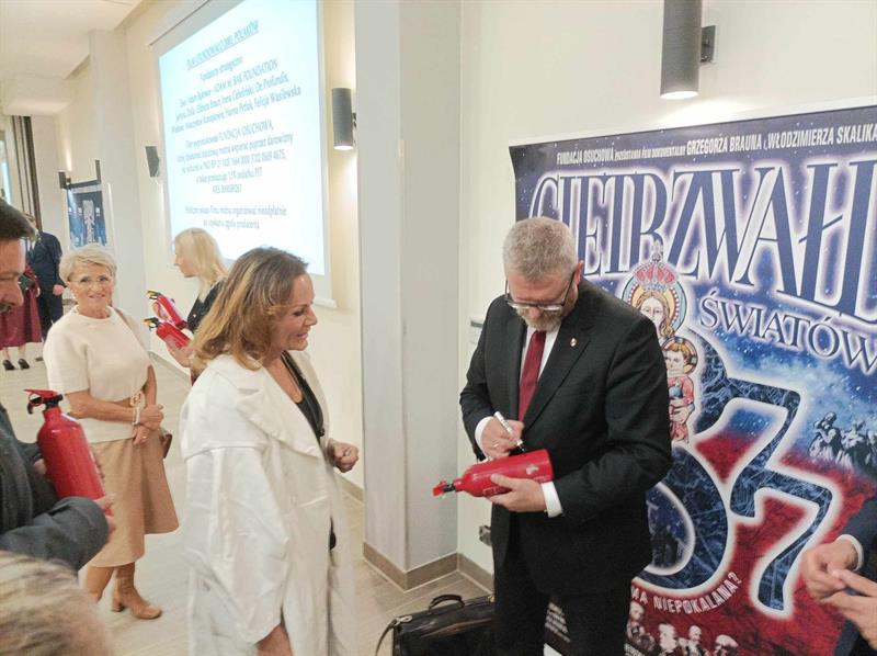 Przed seansem europoseł rozdawał swoim fanom autografy. Wielu z nich podsuwało mu do podpisania małe gaśnice - nawiązując do wydarzenia z grudnia ub. roku, gdy Grzegorz Braun gaśnicą proszkową zgasił w Sejmie świece chanukowe.