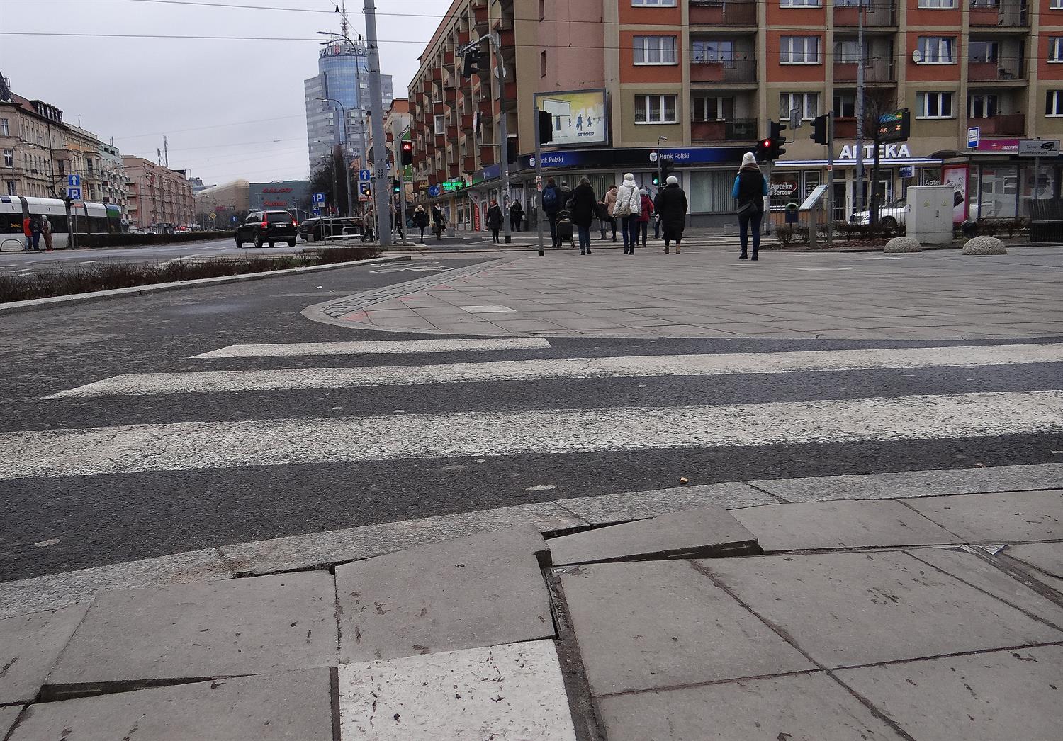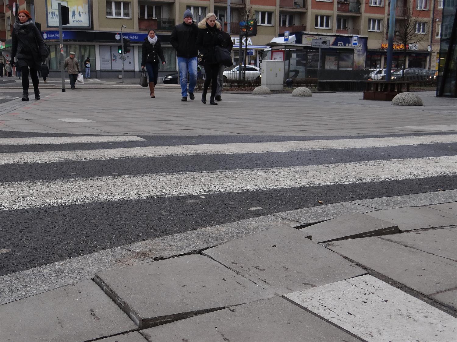 Jedna ze sztandarowych inwestycji, na którą z kasy miasta wydanych zostało niedawno około 8 mln zł. I takie chodniki. Centrum Szczecina, plac Żołnierza Polskiego. Cały rząd chyboczących się, koślawych płytek dokładnie na trasie pieszych, gdzie przecina ją rozwidlenie rowerowych ścieżek. Okres gwarancji już minął. ©℗