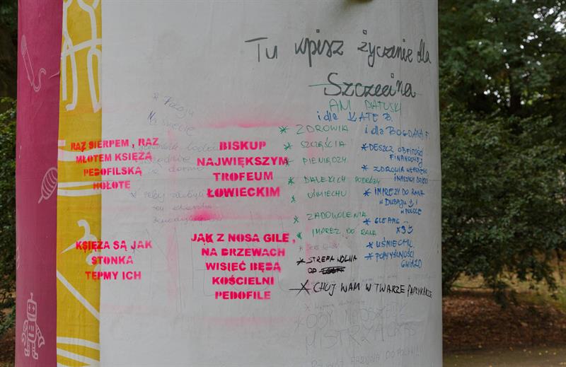 „Biskup największym trofeum łowieckim", „Księżą są jak stonka, tępmy ich!”, "Jak z nosa gile, na drzewach będą wisieć księża pedofile" - między innymi takie napisy pojawiły się na słupach w parku Andersa w Szczecinie. Polityk Solidarnej Polski i radny klubu Prawa i Sprawiedliwości w Radzie Miasta Dariusz Matecki poinformował, że w tej sprawie zostało złożone zawiadomienie do prokuratury.