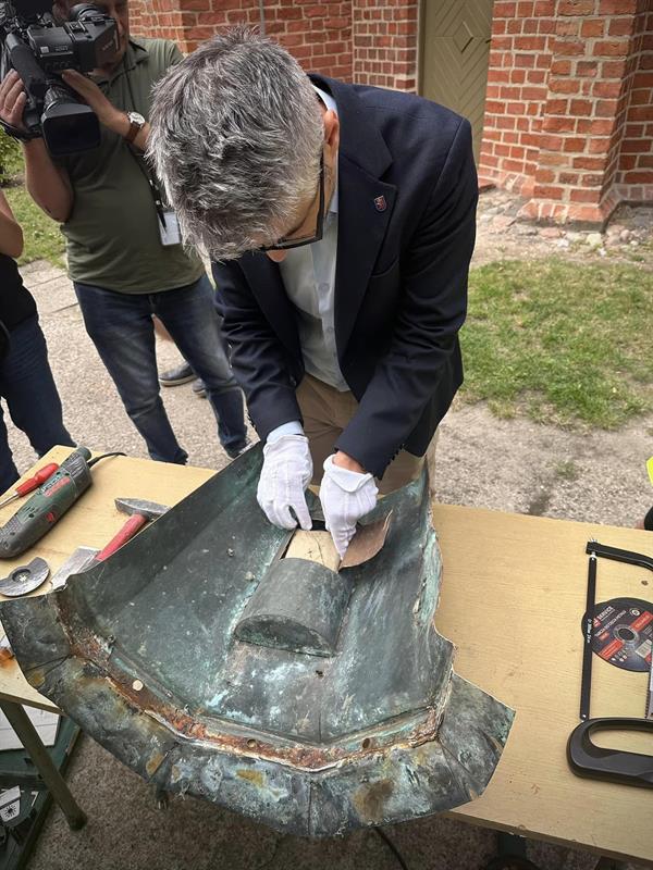 Otwarcie kapsuły nadzorował je Miejski Konserwator Zabytków Michał Dębowski, a o swoim odkryciu poinformował w mediach społecznościowych. To niezwykle ważne z punktu widzenia historii kościoła i miasta odkrycie, które zawiera bardzo ważne informacje. Na dwóch pergaminowych kartach zapisanych obustronnie Kurrentschriftem dowiadujemy się o ukończeniu odbudowy wieży kościelnej po pożarze, jaki miał miejsce w 1863 r. Dokument datowany jest na 24 sierpnia 1865 r. Znajdują się na nim również podpisy komisji oraz pieczęć parafii ewangelickiej w Altdamm. W kapsule znaleziono też miedzianą blaszkę z wygrawerowanymi nazwiskami osób wykonujących prace kowalskie w miedzi. Dokument niebawem zostanie poddany szczegółowej analizie i pracom konserwatorskim, a następnie przekazany do Archiwum Państwowego w Szczecinie.