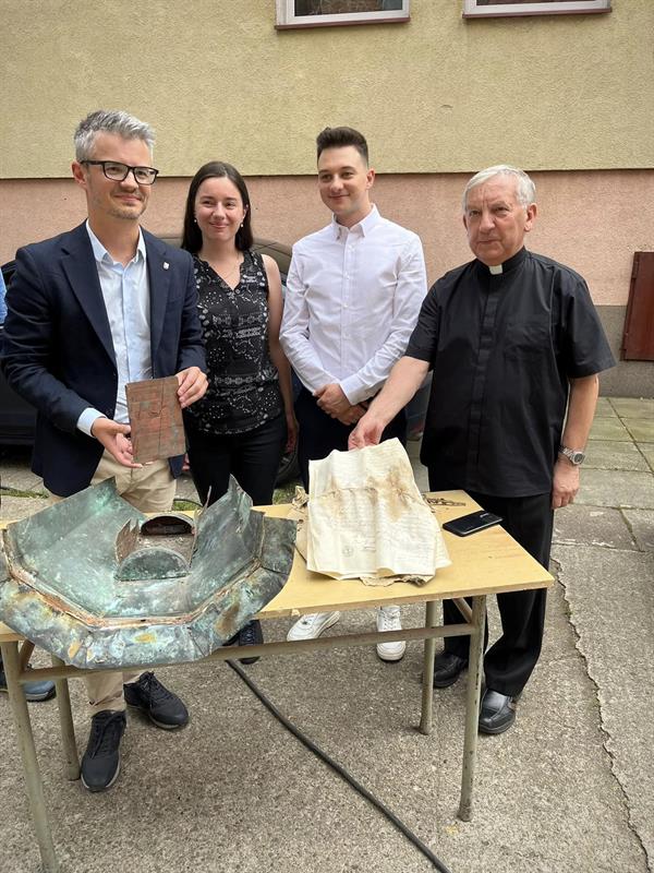 Dwie karty pergaminowego papieru i grawerowana blaszka – to artefakty, które znajdowały się w otwartej przez Michała Dębowskiego, Miejskiego Konserwatora Zabytków, kapsule czasu. Znaleziono ją podczas remontu wieży kościoła pw. Wniebowzięcia NMP w Dąbiu. To ważne historyczne dokumenty zawierające informacje na temat fundatorów i budowniczych zaangażowanych w odbudowę świątyni i kościelnej wieży w drugiej połowie XIX wieku.