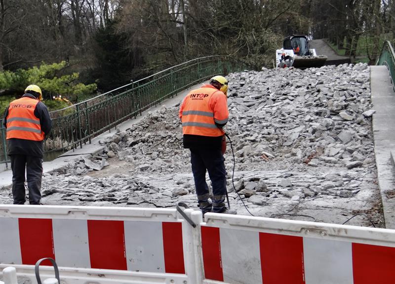 Minął pierwszy miesiąc gruntownej renowacji zabytkowego mostku nad Rusałką w parku Kasprowicza. Po wyłączeniu z eksploatacji i demontażu jego balustrad, usunięto betonową nakładkę nawierzchni.